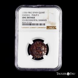 Philip II (1556-1598). Cuartillo. ND (1566-1572). Cuenca. Ermine. (Cal-79). Bi. Despite its excellent mintage, some researchers consider it a contemporary counterfeit. Slabbed by NGC as UNC Details, Environmental Damage. Est...100,00.