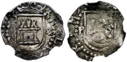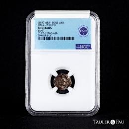 Philip II (1556-1598). 1/4 real. ND (1577-88). Lima. (Diego de la Torre). (Cal-Type-56). (EMO-449 (Plate coin)). Ag. 0,87 g.  ★ on the obverse and P on the reverse. A strong example with clear mintmarks and a rather bold castle on the obverse. Toned to a nice dusty gray, only a touch of flan waviness can be counted against this silver fraction.. EX EMO collection. Slabbed by NGC as XF Details, Bent. Est...350,00.
