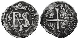 Philip II (1556-1598). 1/2 real. ND (1578-1595). Potosi. B. (Cal-143). Ag. 1,35 g. B below monogram. Rare. Almost VF. Est...100,00.
