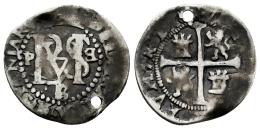 Philip II (1556-1598). 1/2 real. Potosi. B. (Cal-143 var). Ag. 1,52 g. P to the left, inverted B to the right, and B below. Holed. Rare. VF. Est...200,00.
