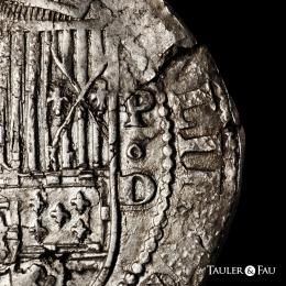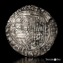 Philip II (1556-1598). 8 reales. ND (1577-1588). Lima. D (Diego de la Torre). (Cal-654). Ag. 27,10 g. Shield between */8 and P/Do. Almost full legends. Flan crack and light double strike, otherwise very nice. Rare. Almost XF. Est...1500,00.
