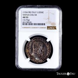 Philip II (1556-1598). 1/2 ducado. ND. Naples. IBR. (Tauler-669). (Vti-349). (Mir-160). Ag. 14,75 g. With the title of King of England and Prince of Spain. Nice old cabinet tone. Rare in this condition. Slabbed by NGC as AU 55. Only 1 finer specimen in the NGC census. Est...500,00.