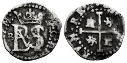 Philip III (1598-1621). 1/2 real. ND (1698-1603). Potosi. B. (Cal-402). Ag. 1,53 g. B to the left of monogram and without mintmark. Rare. VF. Est...250,00.