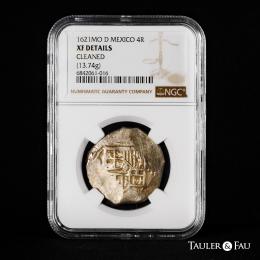 Philip III (1598-1621). 4 reales. 1621. Mexico. D. (Cal-765). Ag. Rare with visible date. Slabbed by NGC as XF Details, Cleaned. The only one certificated with date in the NGC census. Est...500,00.