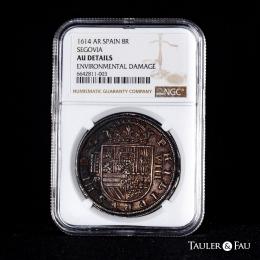 Philip III (1598-1621). 8 reales. 1614. Segovia. AR. (Cal-946). Ag. Aqueduct with 5 arches and 2 tiers. Tone. Light surface oxidation. Rare. Slabbed by NGC as AU Details, Environmental Damage. Est...1500,00.