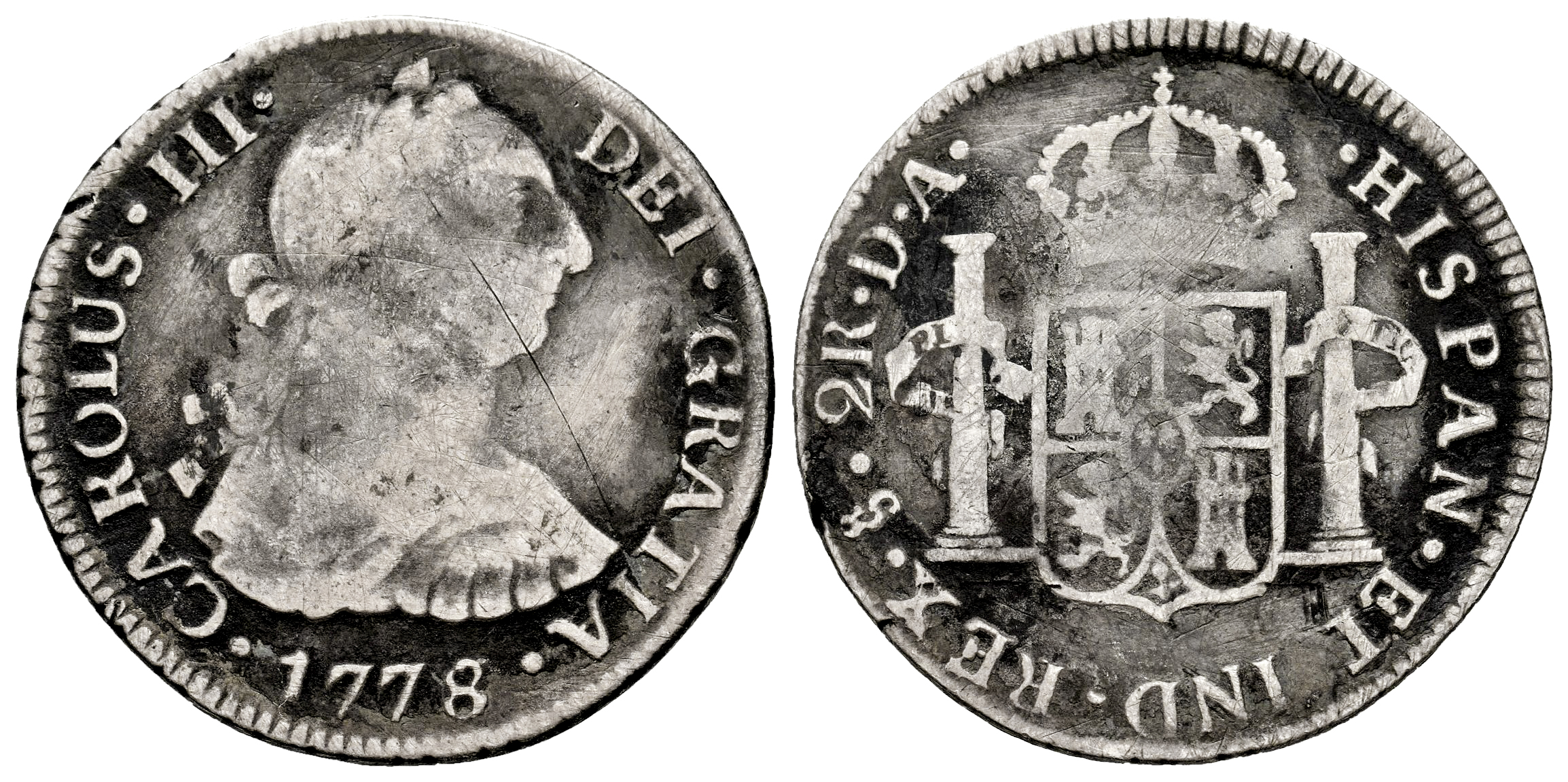 Charles III (1759-1788). 2 reales. 1778/6. Santiago. DA. (Cal-753). Ag. 6,43 g. Overdate. Scratches. Cleaned. Rare. F. Est...100,00.