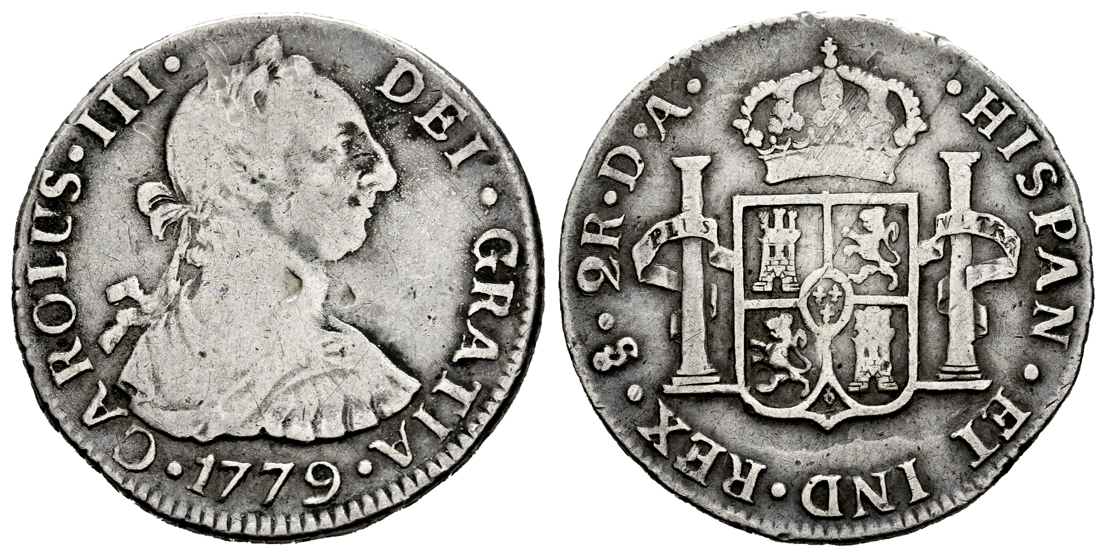Charles III (1759-1788). 2 reales. 1779. Santiago. DA. (Cal-756). Ag. 6,59 g. Scratches on obverse and edge bumps. Rare. Almost VF. Est...200,00.