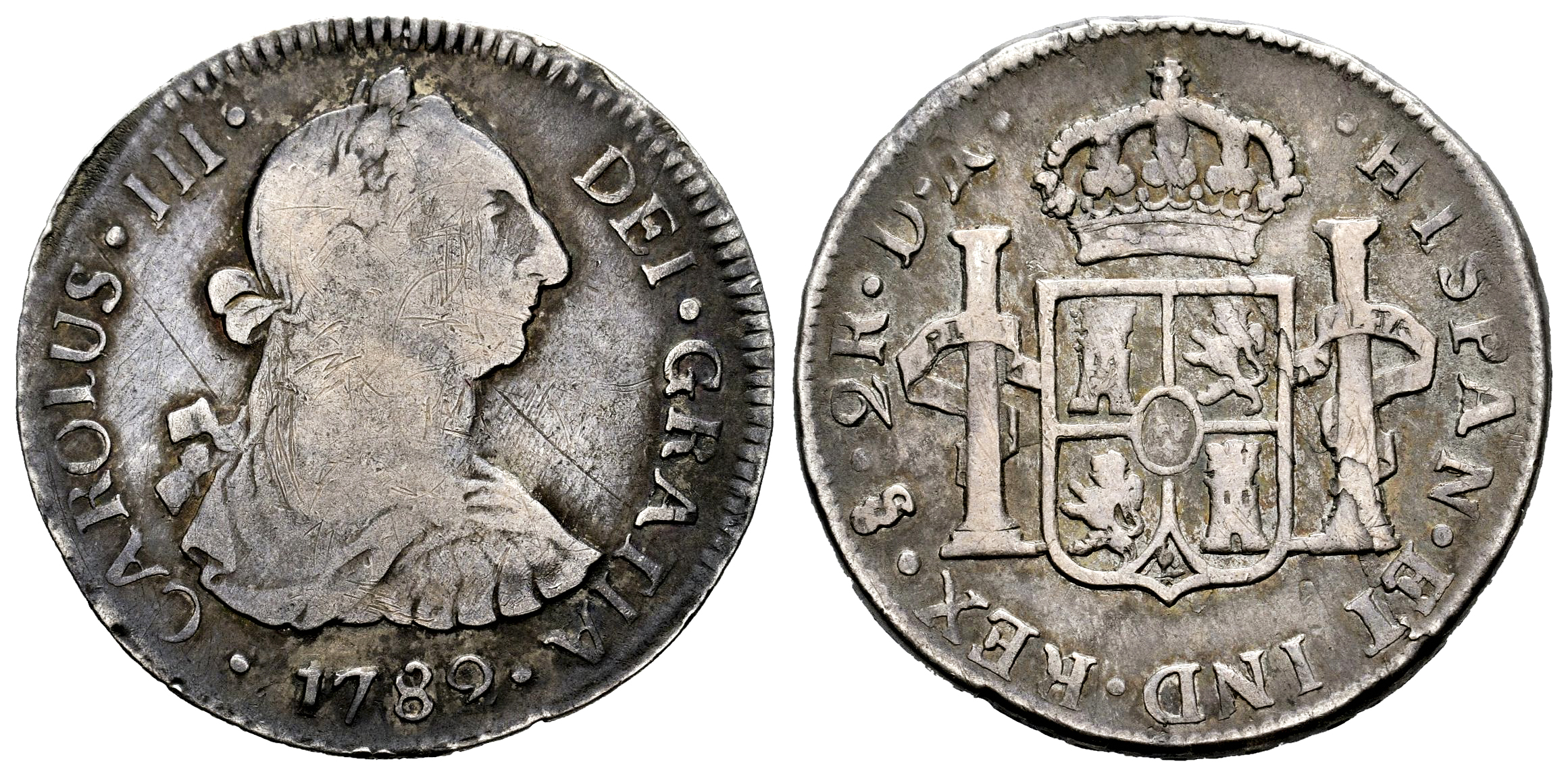 Charles III (1759-1788). 2 reales. 1782. Santiago. DA. (Cal-759). Ag. 6,58 g. Light tone. Extremely rare, few specimens known. Choice F/Almost VF. Est...300,00.