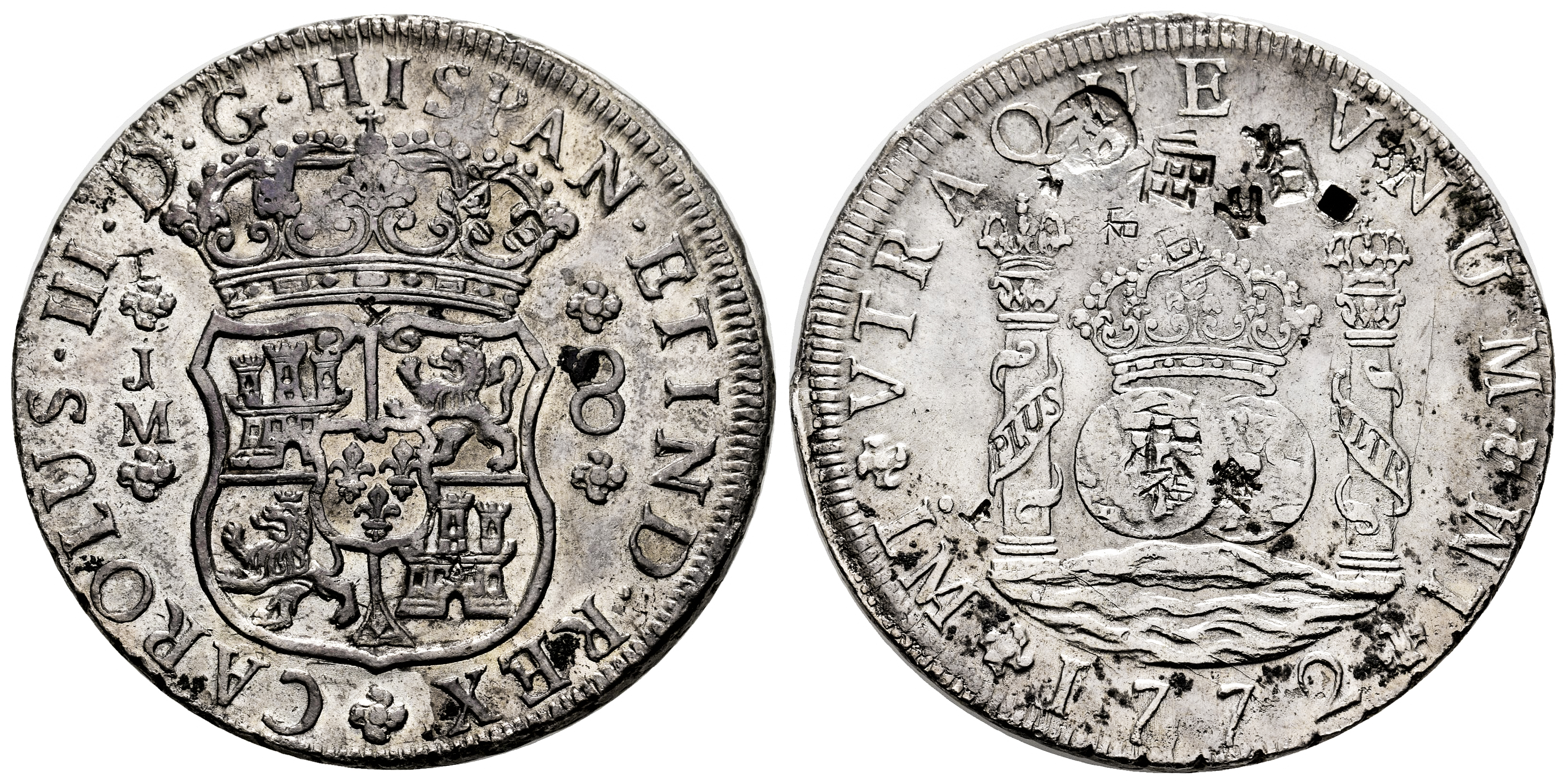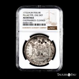 Charles III (1759-1788). 8 reales. 1772. Lima. JM. (Cal-1034). Ag. Dot avobe the first LMA. Minimal oxidation cleaned. Slabbed by NGC as AU Details, Chopmarked, Cleaned. Est...500,00.