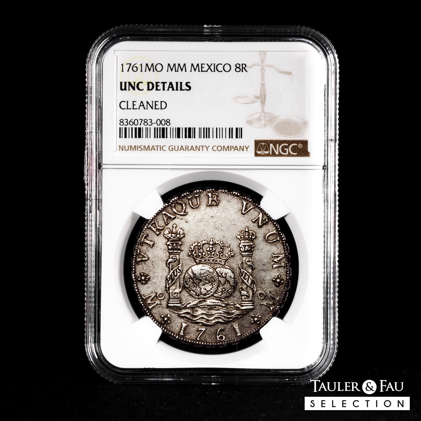 Charles III (1759-1788). 8 reales. 1761. Mexico. MM. (Cal-1075). Ag. Cross between H and I. Planchet flaw in the obverse crown. Slabbed by NGC as UNC Details, Cleaned. Est...650,00.