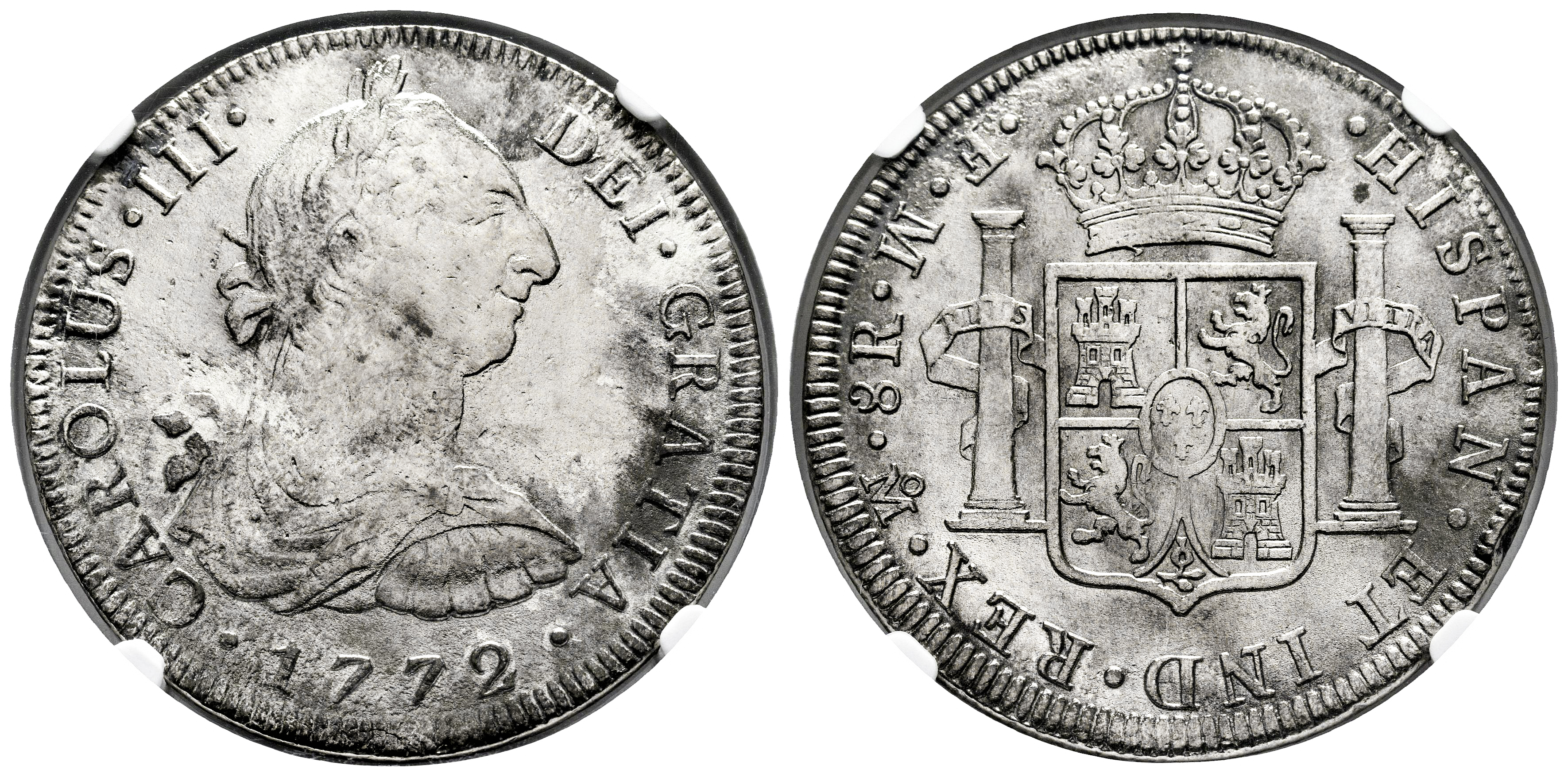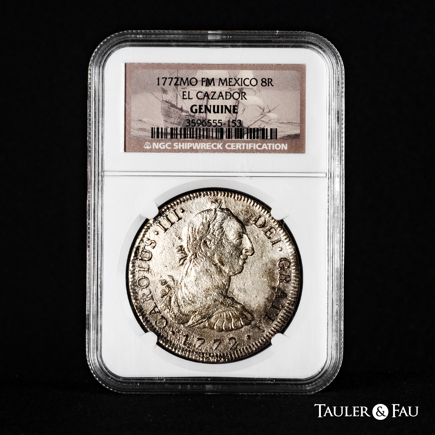 Charles III (1759-1788). 8 reales. 1772. Mexico. FM. (Cal-1105). Ag. Slabbed by NGC as Genuine. Special label "El Cazador". In 1784, the Spanish frigate El Cazador set sail from Veracruz bound for New Orleans, carrying a large shipment of silver coins to alleviate the cash shortage in Spanish Louisiana. The region was facing an economic crisis that affected trade and administration, making the arrival of this cargo crucial. However, on January 11 of that year, El Cazador departed and never reached its destination. It is believed to have sunk in the Gulf of Mexico, possibly due to a storm or a navigation error, resulting in the loss of its valuable cargo. This disaster worsened Louisiana's economic instability and weakened Spain's control over the territory. As a consequence, Spain eventually returned the region to France in 1803, and shortly after, Napoleon sold it to the United States in the famous Louisiana Purchase. Centuries later, in 1993, a fishing boat discovered a treasure trove of coins at the bottom of the Gulf of Mexico, finally confirming the story of El Cazador and its tragic fate. Est...500,00.