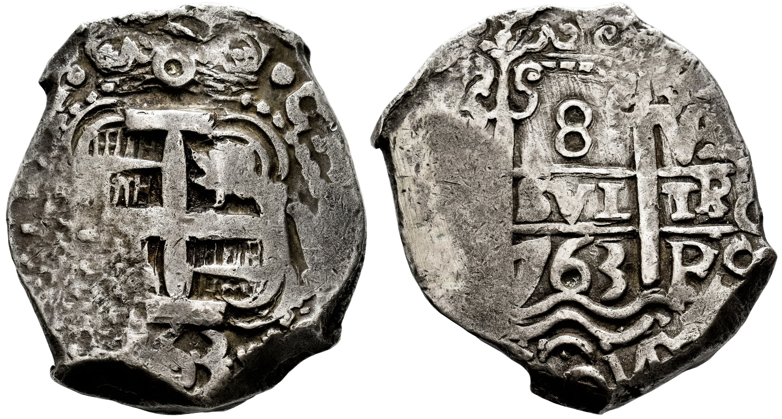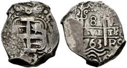 Charles III (1759-1788). 8 reales. 1763. Potosi. V. (Cal-1139). Ag. 26,94 g. Double date and double assayer. Toned. Choice VF. Est...500,00.