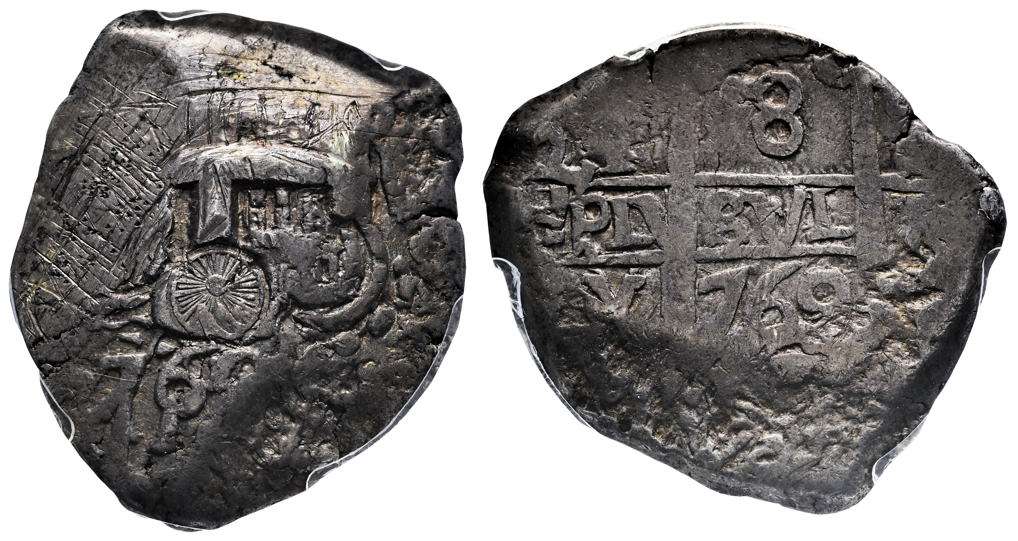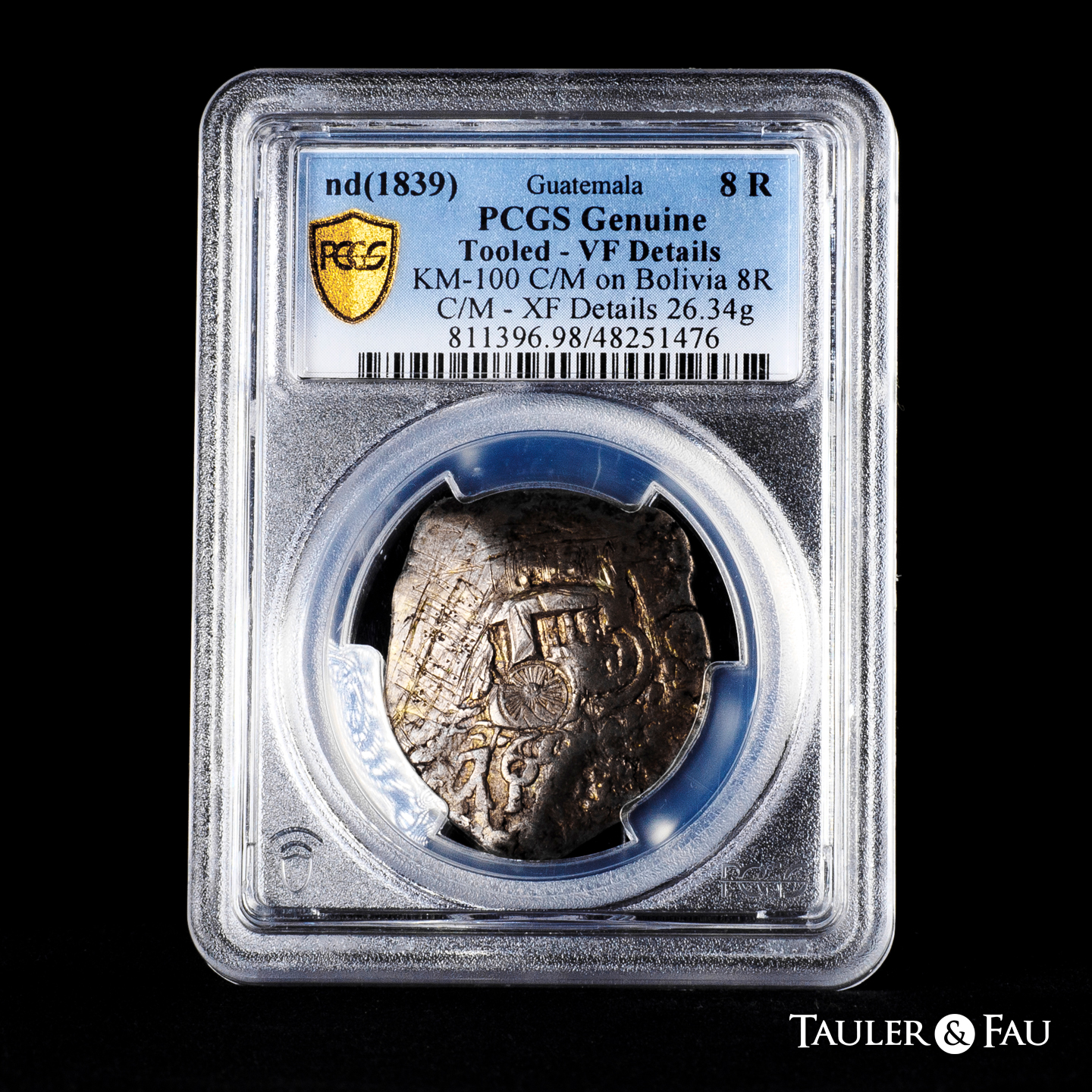 Charles III (1759-1788). 8 reales. ND (1839). (Cal-1147 var). (Km-100). Ag. 26,34 g. Guatemala Type II countermark on 8 reales of 1769-V/Y minted in Potosí during the reign of Carlos III. Double date. Tone. Rare. Slabbed by PCGS as VF Details, Tooled. C/M - XF Details. NGC-VF. Est...800,00.