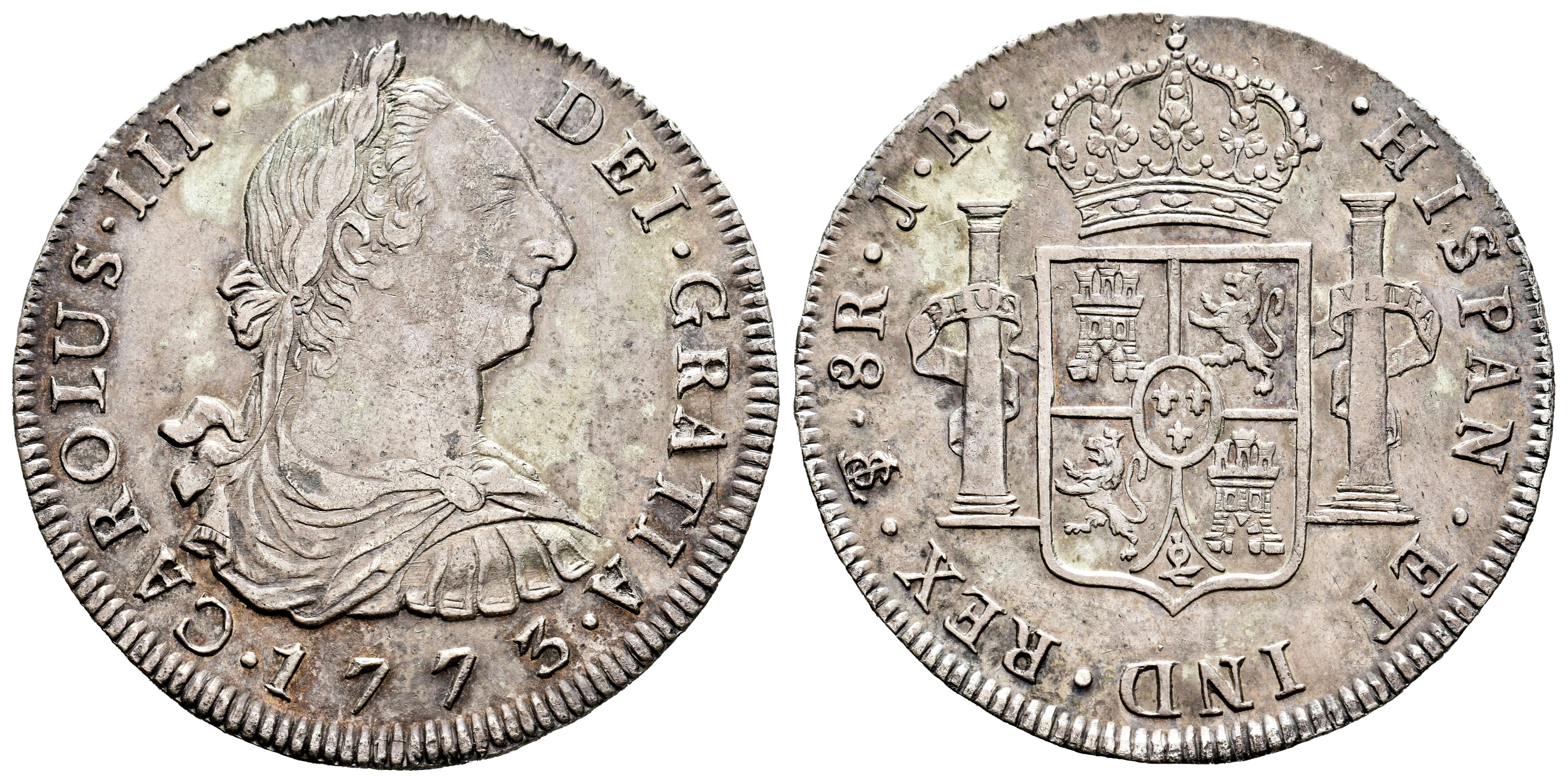 Charles III (1759-1788). 8 reales. 1773. Potosi. JR. (Cal-1169). Ag. 26,71 g. First-year bust. Slight patina. Almost XF. Est...300,00.