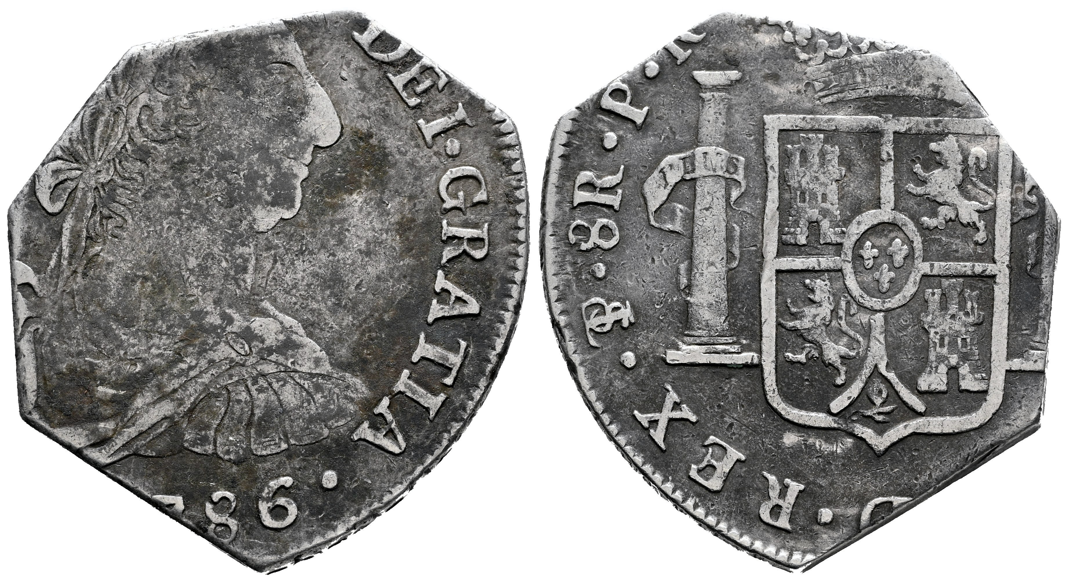 Charles III (1759-1788). 8 reales. 1786. Potosi. PR. (Cal-1192). Ag. 15,75 g. Clipped for circulate in North Africa. VF. Est...200,00.