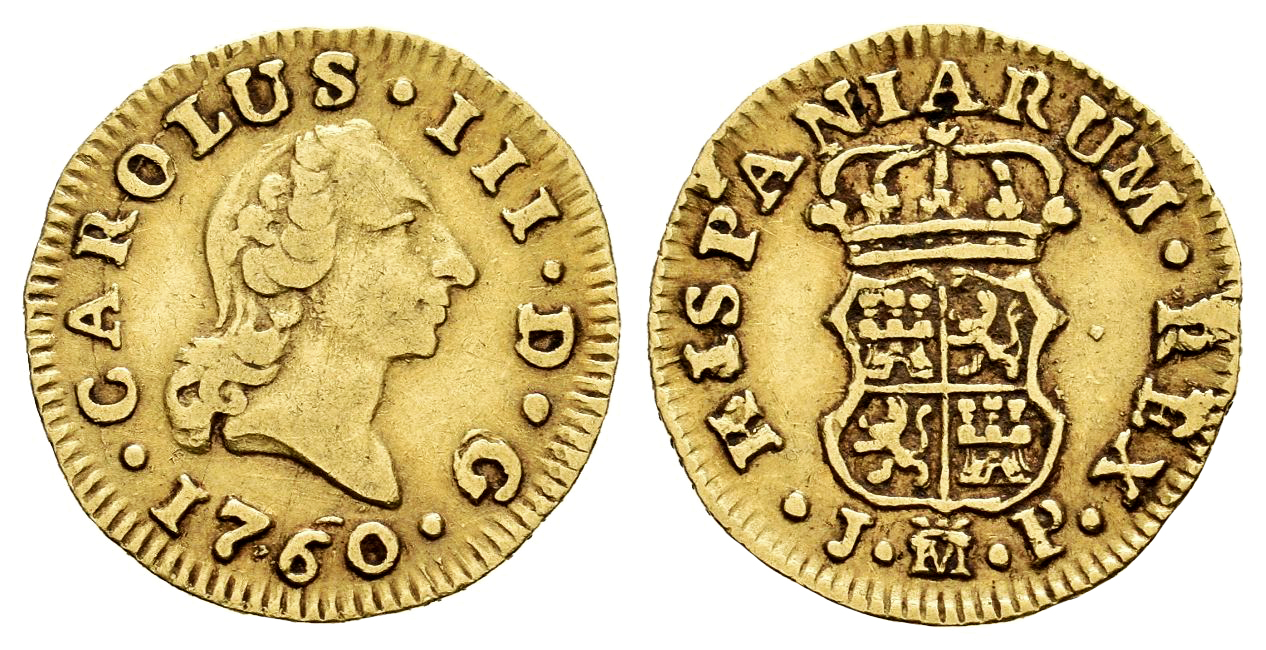 Charles III (1759-1788). 1/2 escudo. 1760. Madrid. JP. (Cal-1242). Au. 1,75 g. "Rat nose" type. Flat crown. Slight wavy flan. Scarce. VF. Est...250,00.