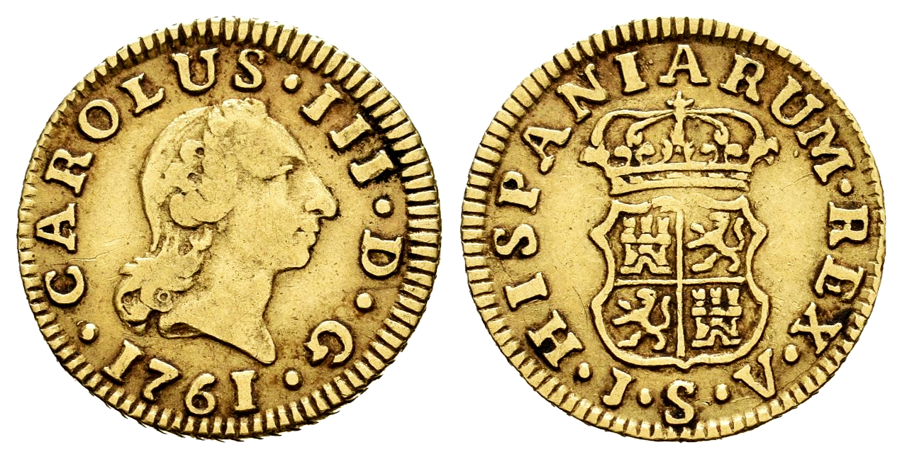 Charles III (1759-1788). 1/2 escudo. 1761. Sevilla. JV. (Cal-1289). Au. 1,72 g. "Rat nose" type. VF. Est...250,00.