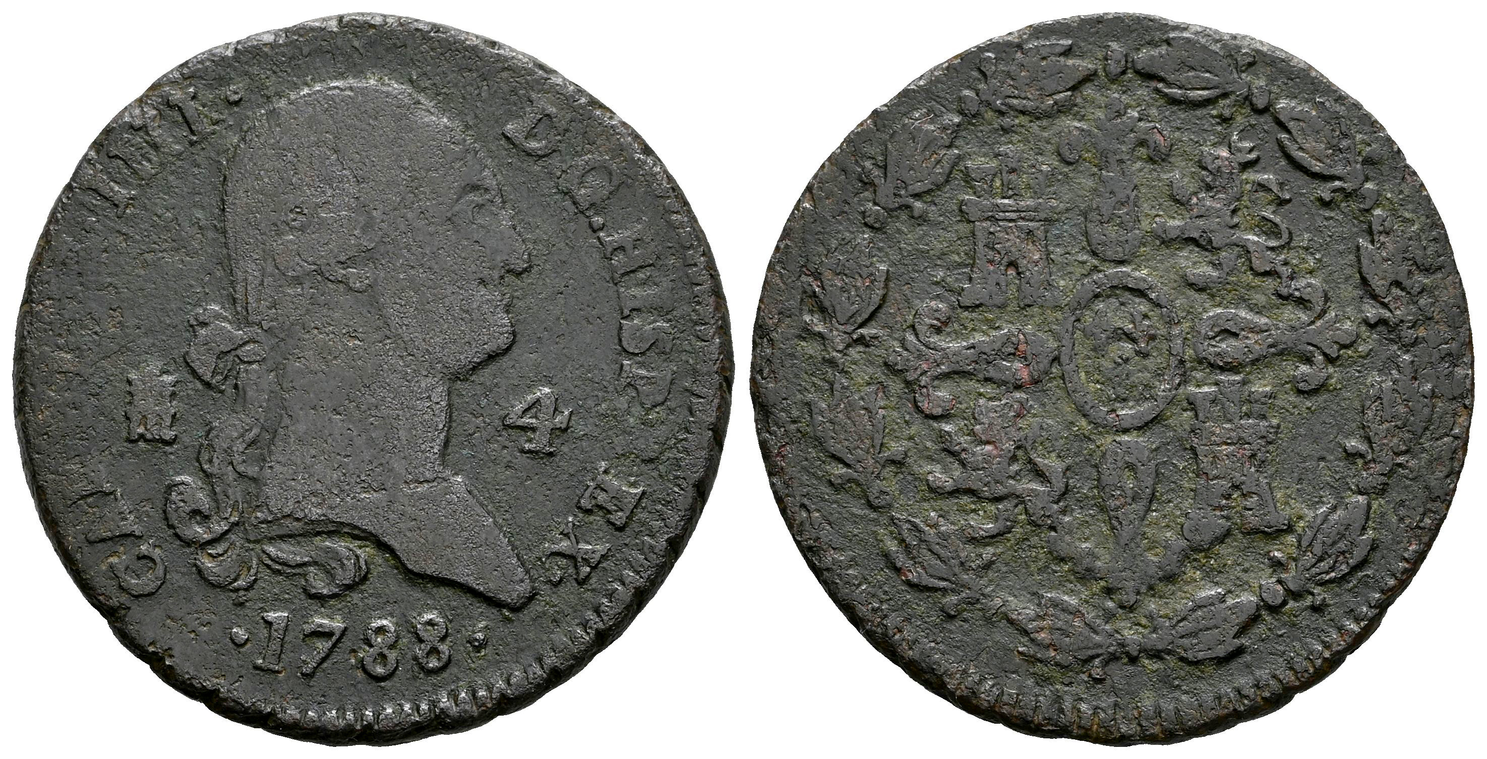 Charles IV (1788-1808). 4 maravedis. 1788. Segovia. (Cal-42). Ae. 5,31 g. Rare. Choice F. Est...60,00.