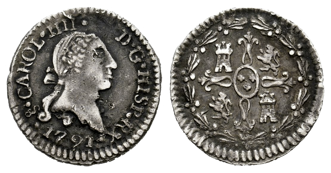 Charles IV (1788-1808). 1/4 real. 1791. Santiago. (Cal-184). Ag. 0,84 g. Bust of Charles III and Ordinal IIII. Rare. VF/Choice VF. Est...200,00.