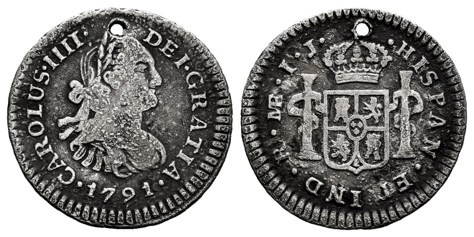 Charles IV (1788-1808). 1/2 real. 1791. Lima. IJ. (Cal-229). Ag. 1,45 g. First King´s bust. Holed. Rare. Choice F. Est...70,00.