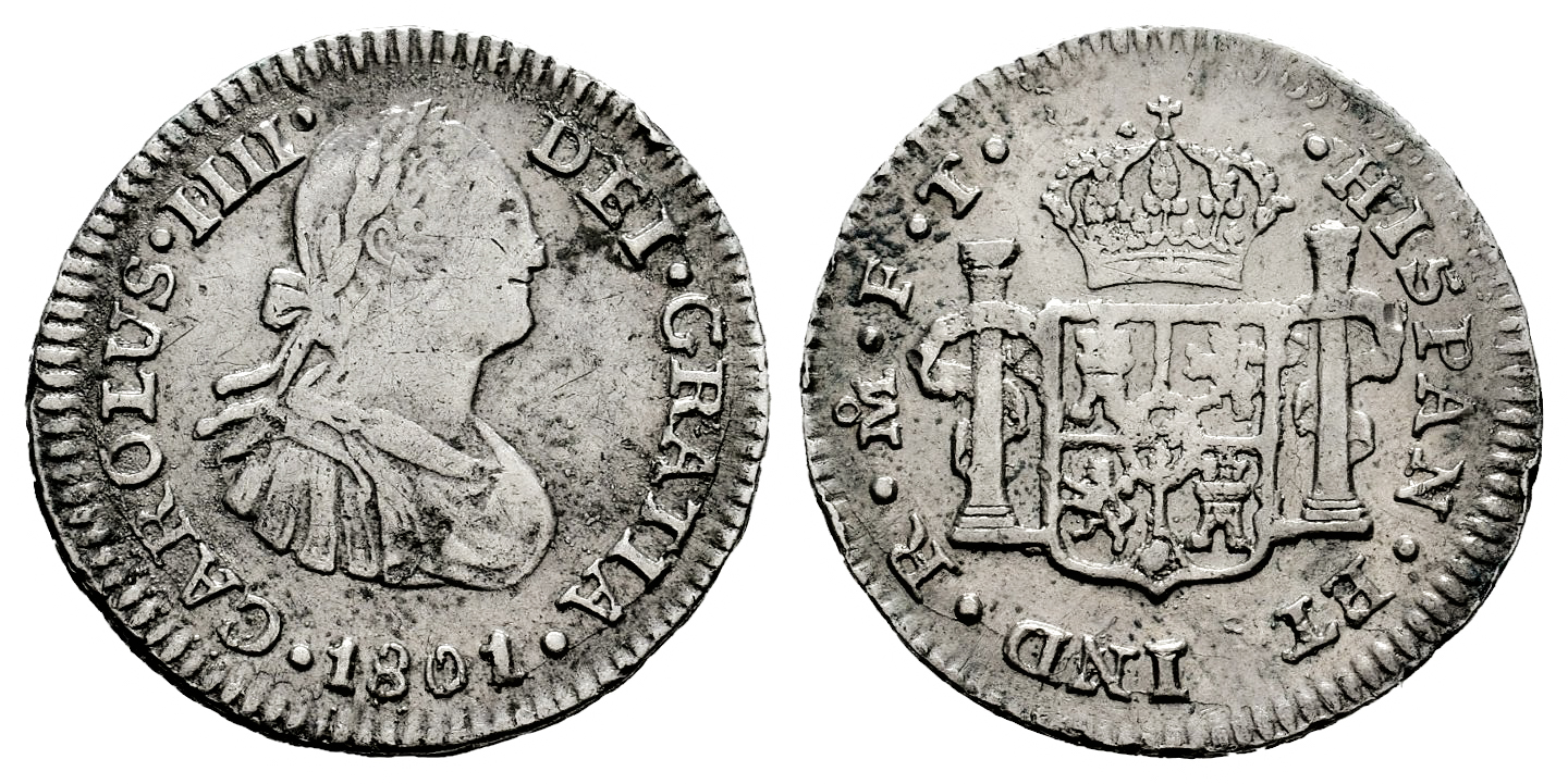 Charles IV (1788-1808). 1/2 real. 1801. Mexico. FT. (Cal-287). Ag. 1,63 g. Choice VF/VF. Est...35,00.