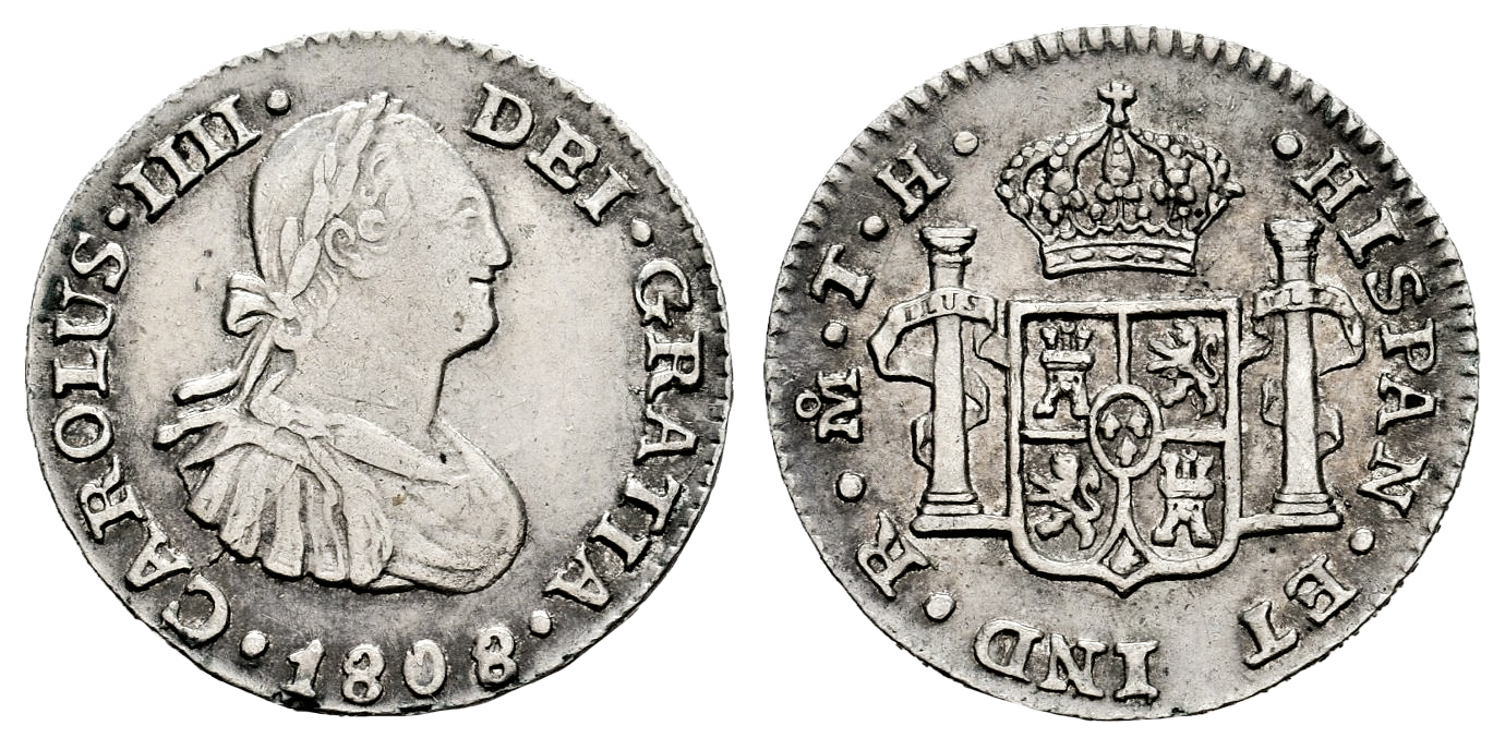 Charles IV (1788-1808). 1/2 real. 1808. Mexico. TH. (Cal-296). Ag. 1,69 g. Minimal hairlines. Soft tone. Traces of luster. Ex Martí Hervera (24/02/1996), lot 567. Choice VF/Almost XF. Est...65,00.