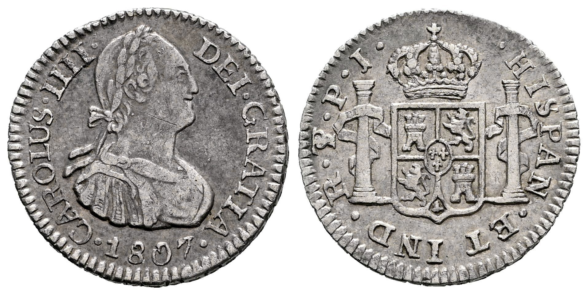 Charles IV (1788-1808). 1/2 real. 1807. Potosi. PJ. (Cal-317). Ag. 1,73 g. Toned. VF. Est...50,00.
