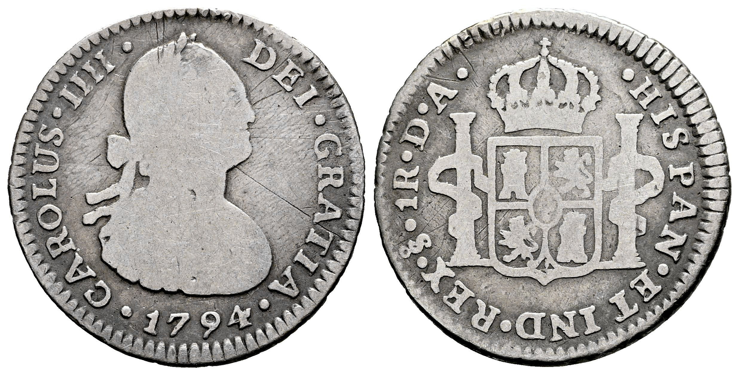 Charles IV (1788-1808). 1 real. 1794. Santiago. DA. (Cal-510). Ag. 3,12 g. Scarce. F. Est...65,00.