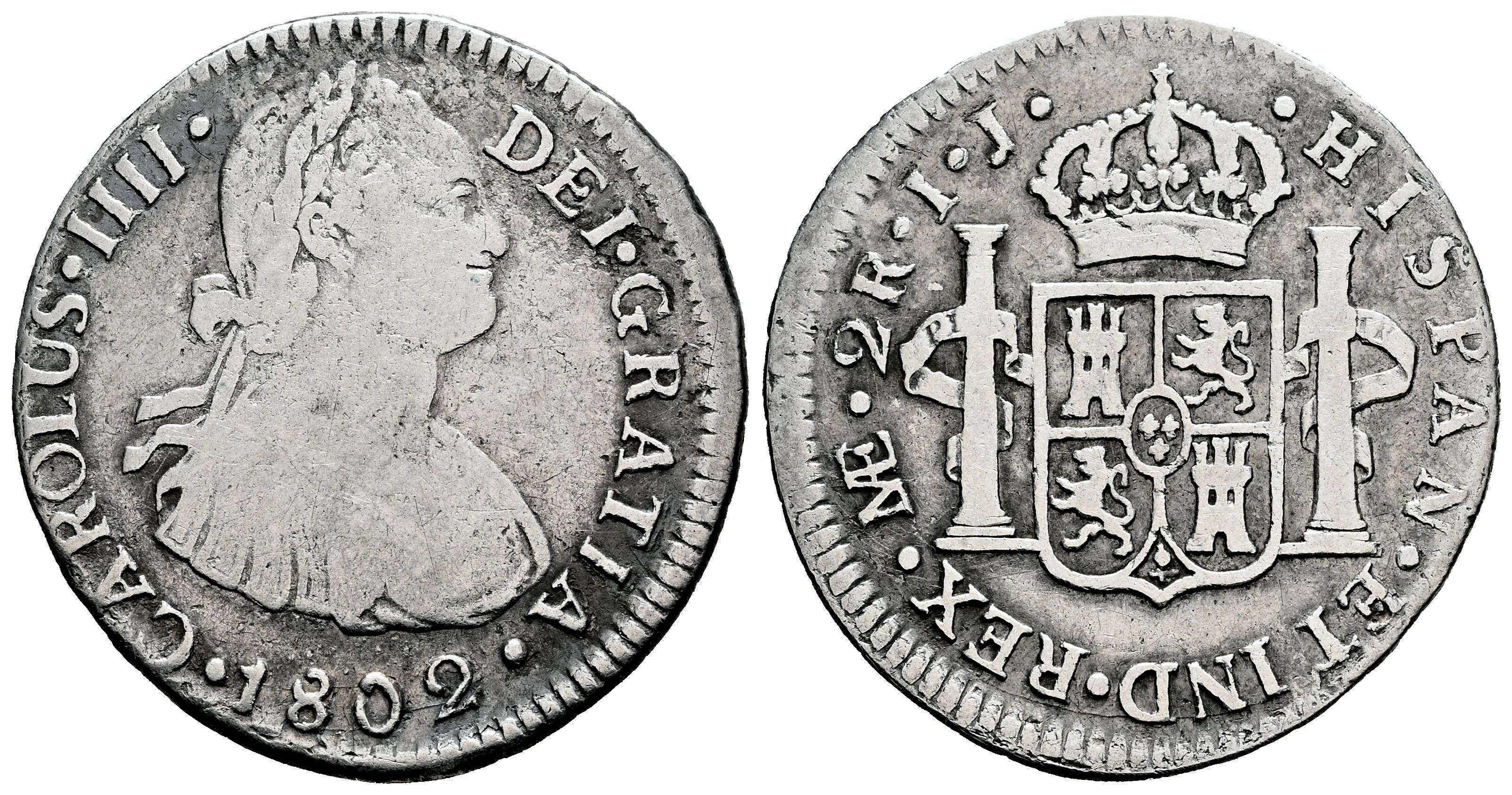 Charles IV (1788-1808). 2 reales. 1802. Lima. IJ. (Cal-585). Ag. 6,54 g. Choice F/Almost VF. Est...60,00.