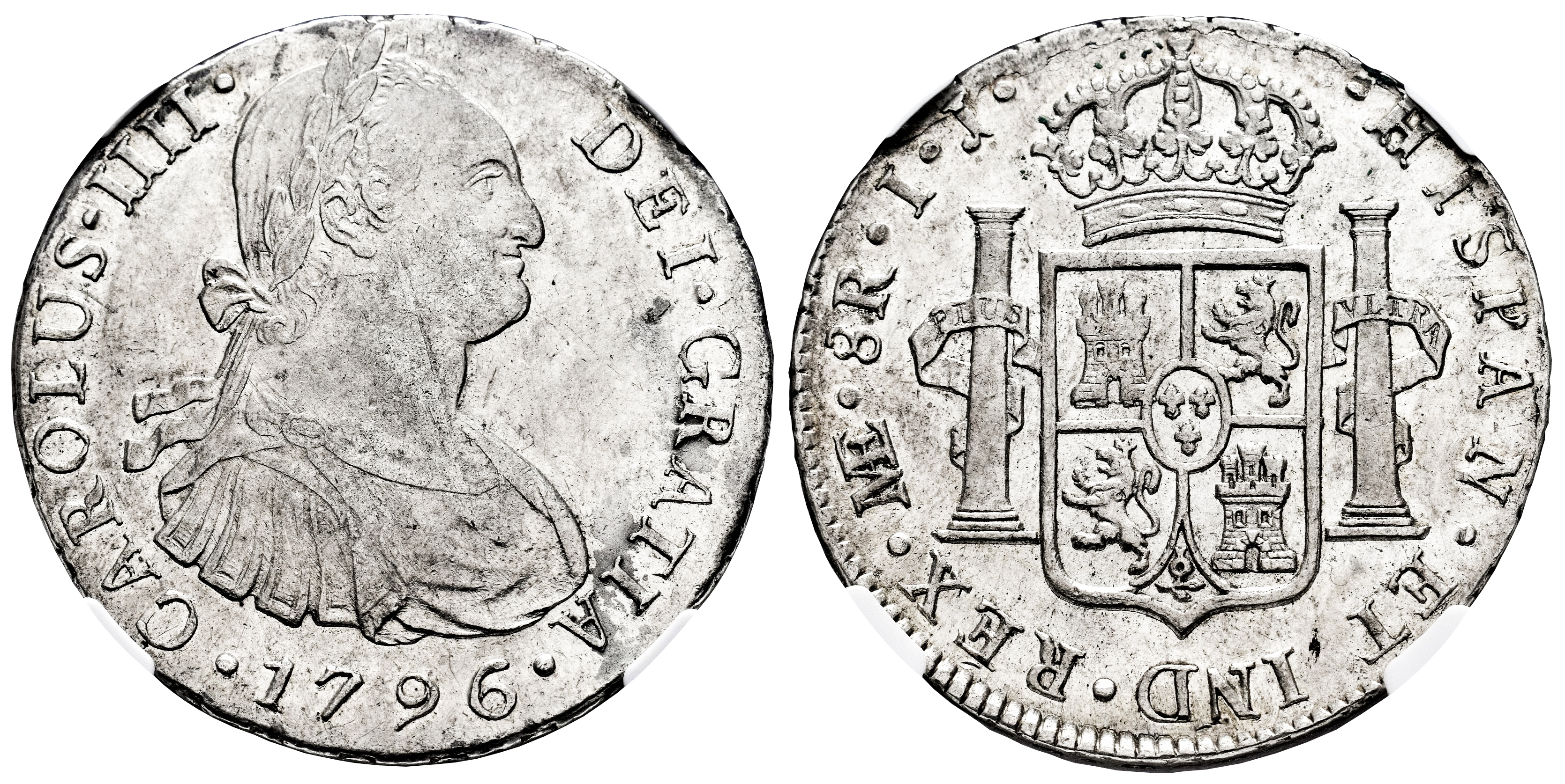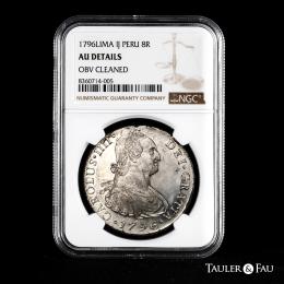 Charles IV (1788-1808). 8 reales. 1796. Lima. IJ. (Cal-913). Ag. Traces of luster. Slabbed by NGC as AU Details, Obv. cleaned. Est...300,00.
