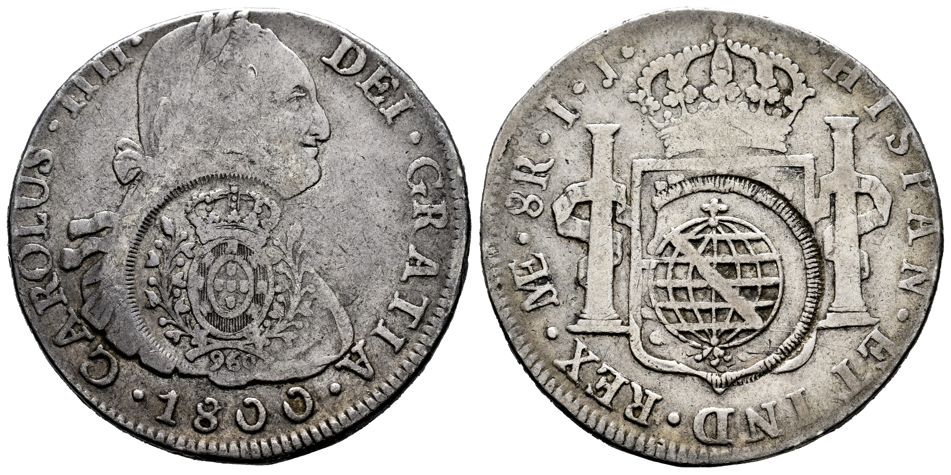 Charles IV (1788-1808). 960 reis. ND (1808). Ag. 26,25 g. Double countermark of Minas Gerais for circulation in Brazil, struck over an 1800-IJ 8 reales from Lima, issued under Charles IV. Almost VF. Est...350,00.