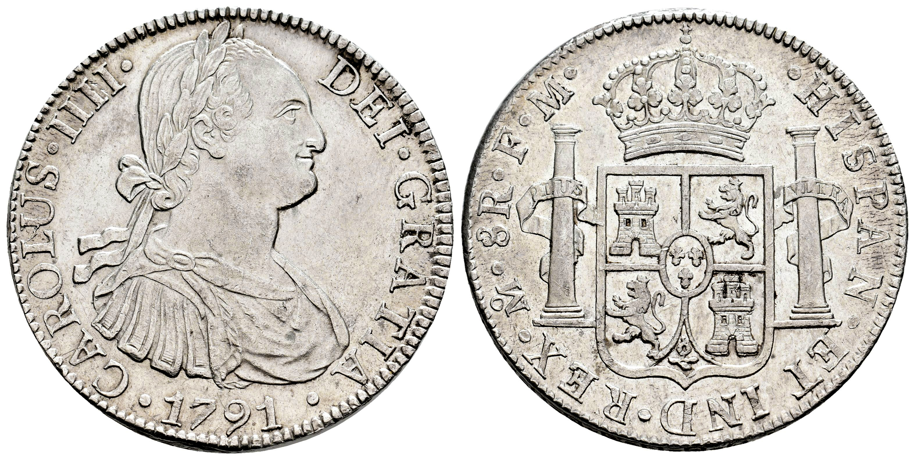 Charles IV (1788-1808). 8 reales. 1791. Mexico. FM. (Cal-953). Ag. 26,89 g. First-year king´s bust. Minimal hairlines. Original luster. Scarce in this grade. AU/Almost MS. Est...350,00.
