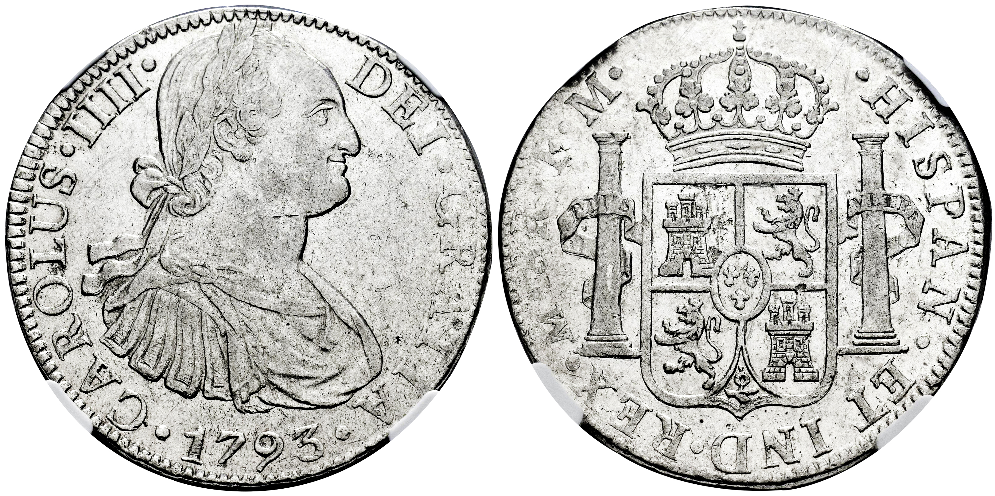 Charles IV (1788-1808). 8 reales. 1793. Mexico. FM. (Cal-955). Ag. Traces of luser and minor scratches. Slabbed by NGC as AU 58. Est...300,00.