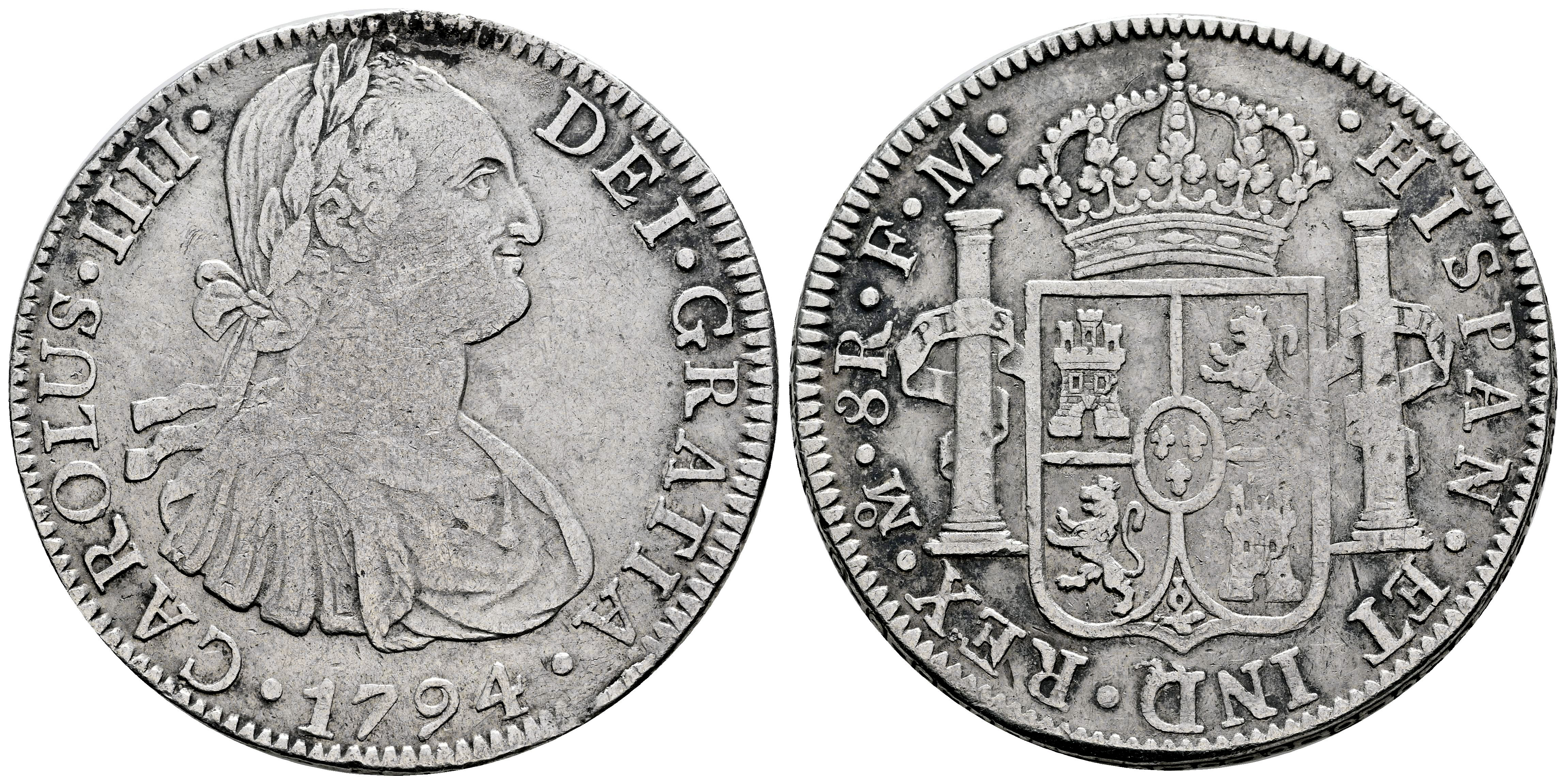 Charles IV (1788-1808). 8 reales. 1794. Mexico. FM. (Cal-956). Ag. 26,72 g. Cleaned. Almost VF. Est...90,00.