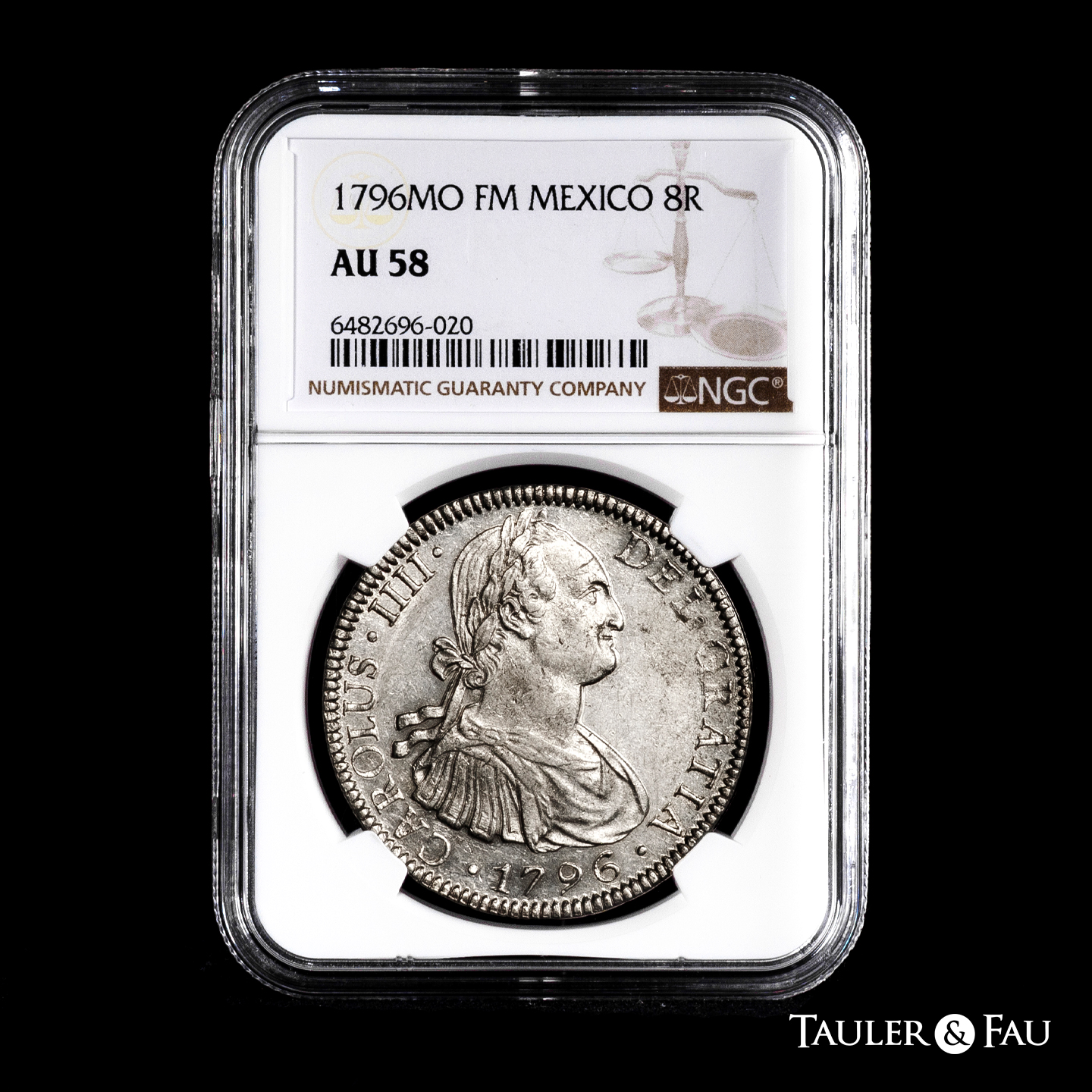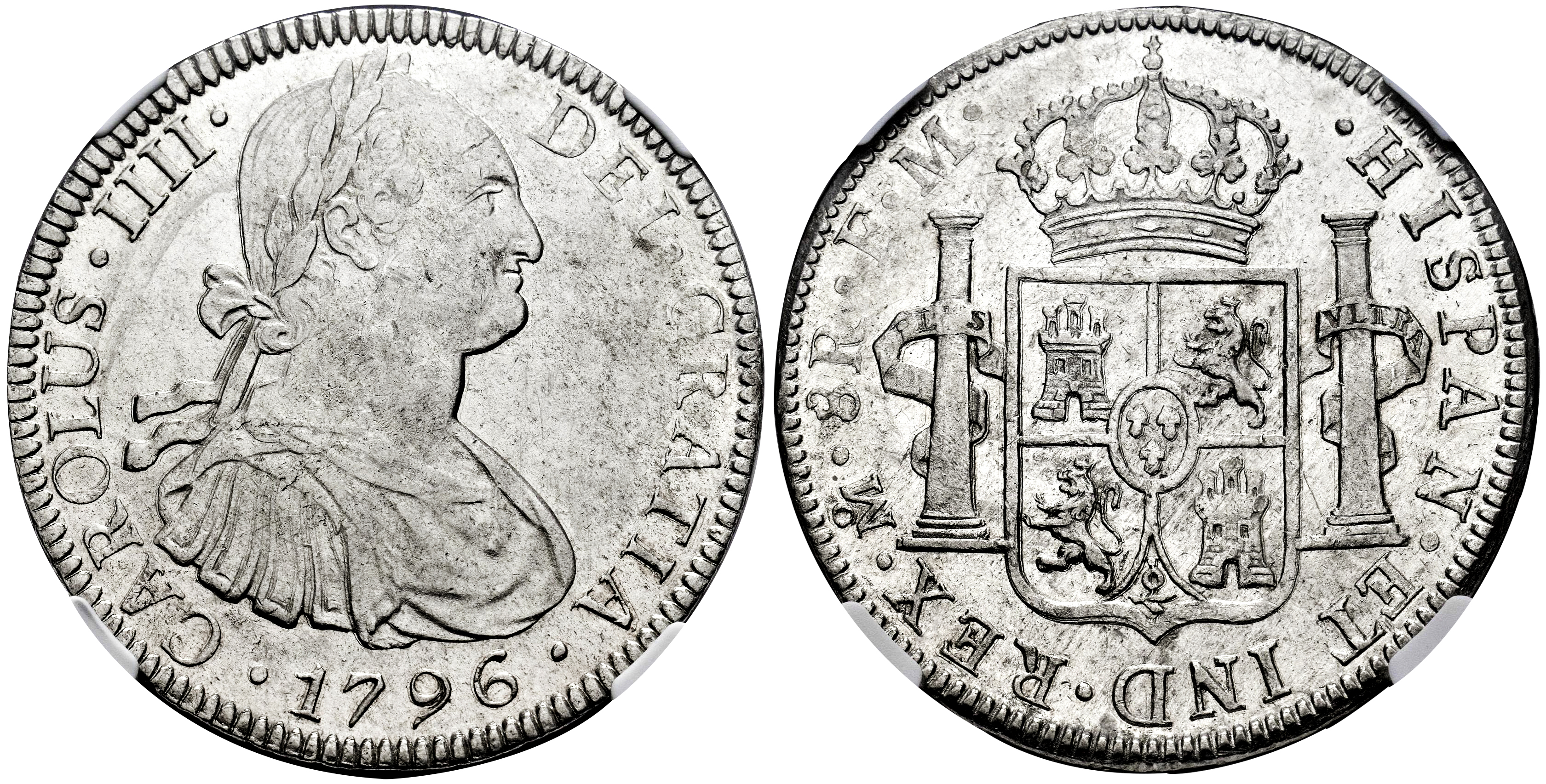 Charles IV (1788-1808). 8 reales. 1796. Mexico. FM. (Cal-959). Ag. Traces of luster. Scarce in this grade. Slabbed by NGC as AU 58. Est...350,00.