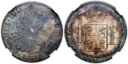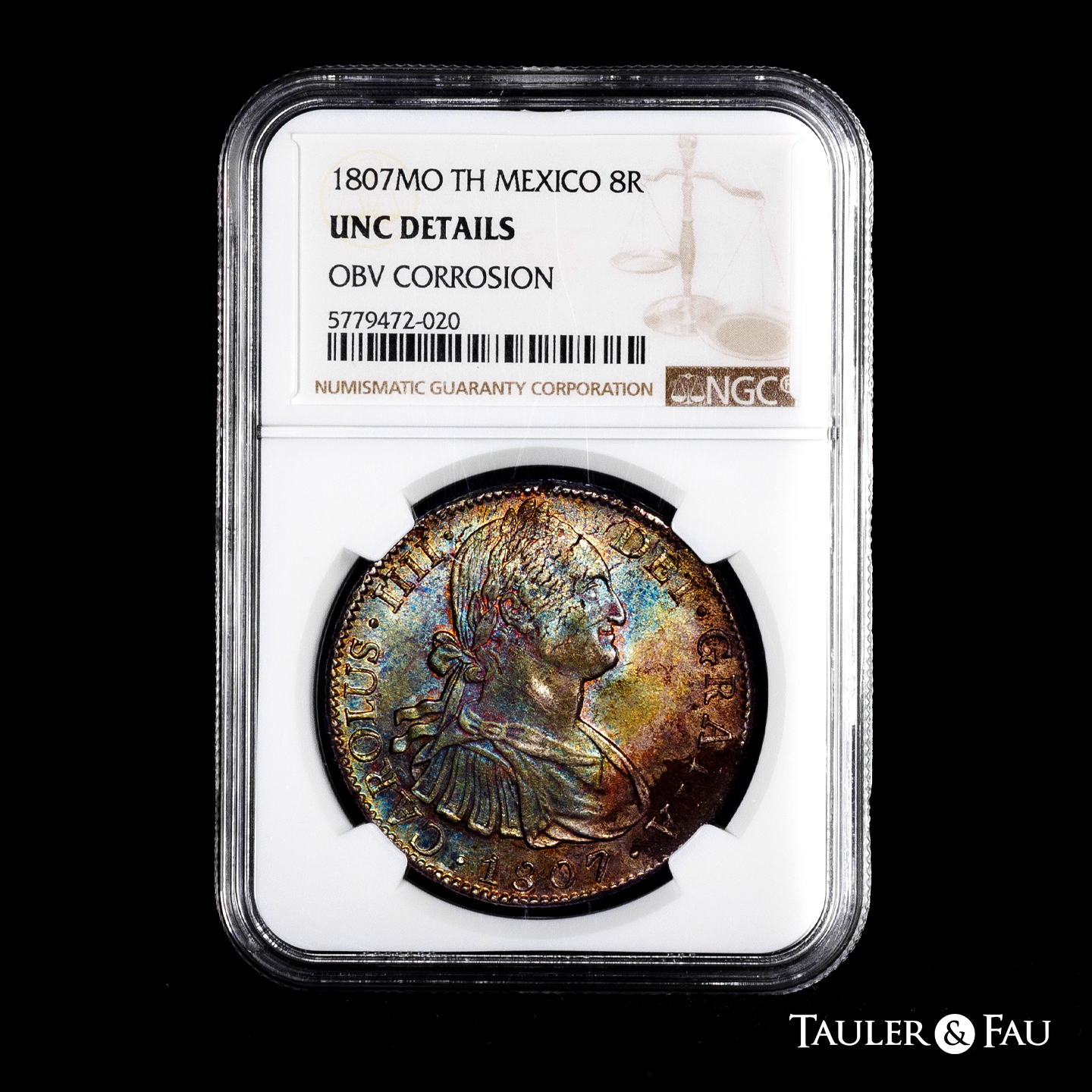 Charles IV (1788-1808). 8 reales. 1807. Mexico. TH. (Cal-986). Ag. Iridiscent patina. Corrosion and stress marks on obverse. Nice reverse with traces of luster. Slabbed by NGC as UNC Details, Obv. corrosion. Est...300,00.