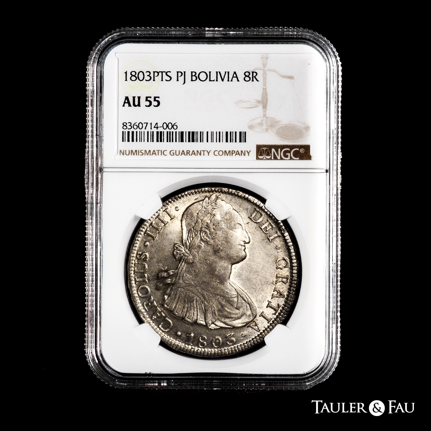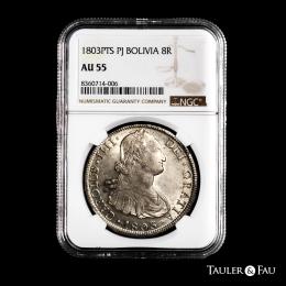 Charles IV (1788-1808). 8 reales. 1803. Potosi. PJ. (Cal-1007). Ag. Lightly toned. Original luster. Scarce in this grade. Slabbed by NGC as AU 55. Est...300,00.