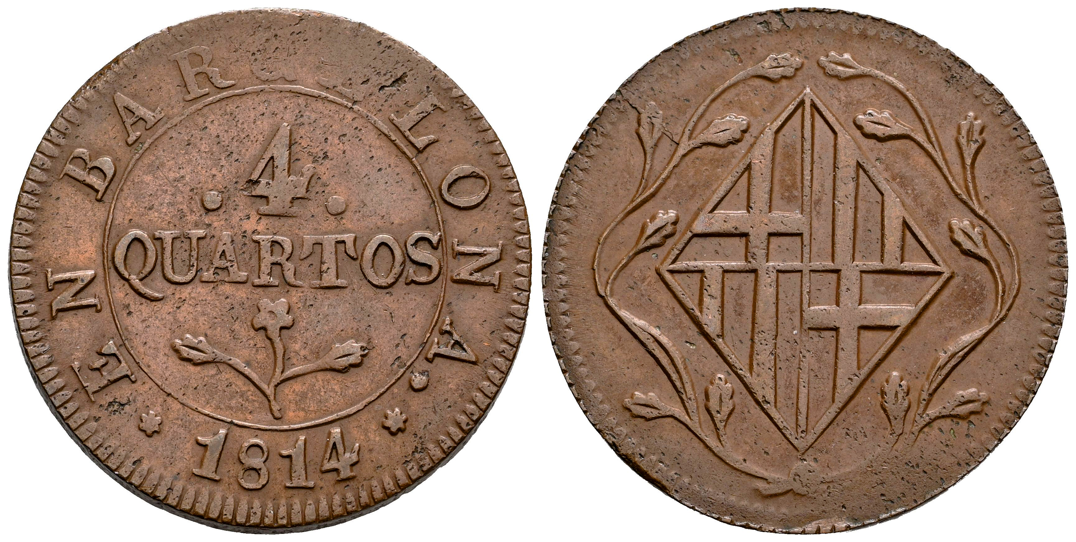 Joseph Napoleon (1808-1814). 4 quartos. 1814. Barcelona. (Cal-22). Ae. 8,42 g. Choice VF/Almost XF. Est...80,00.