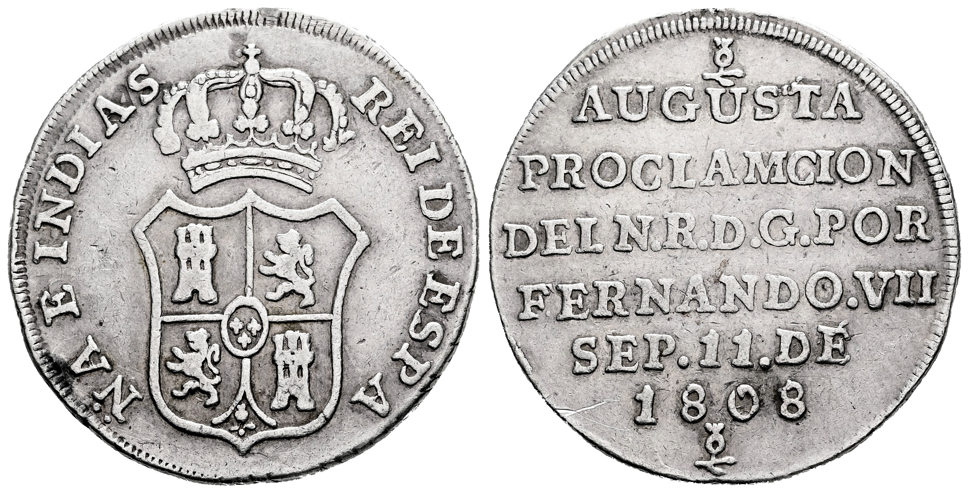 Ferdinand VII (1808-1833). "Proclamation" medal. 1808. Nueva Granada. (Restrepo-M4). (Herrera-39). (Medina-328). Ag. 6,84 g. 2 real module. Traces of welding at 12 o´clock on edge. Scarce. VF. Est...150,00.