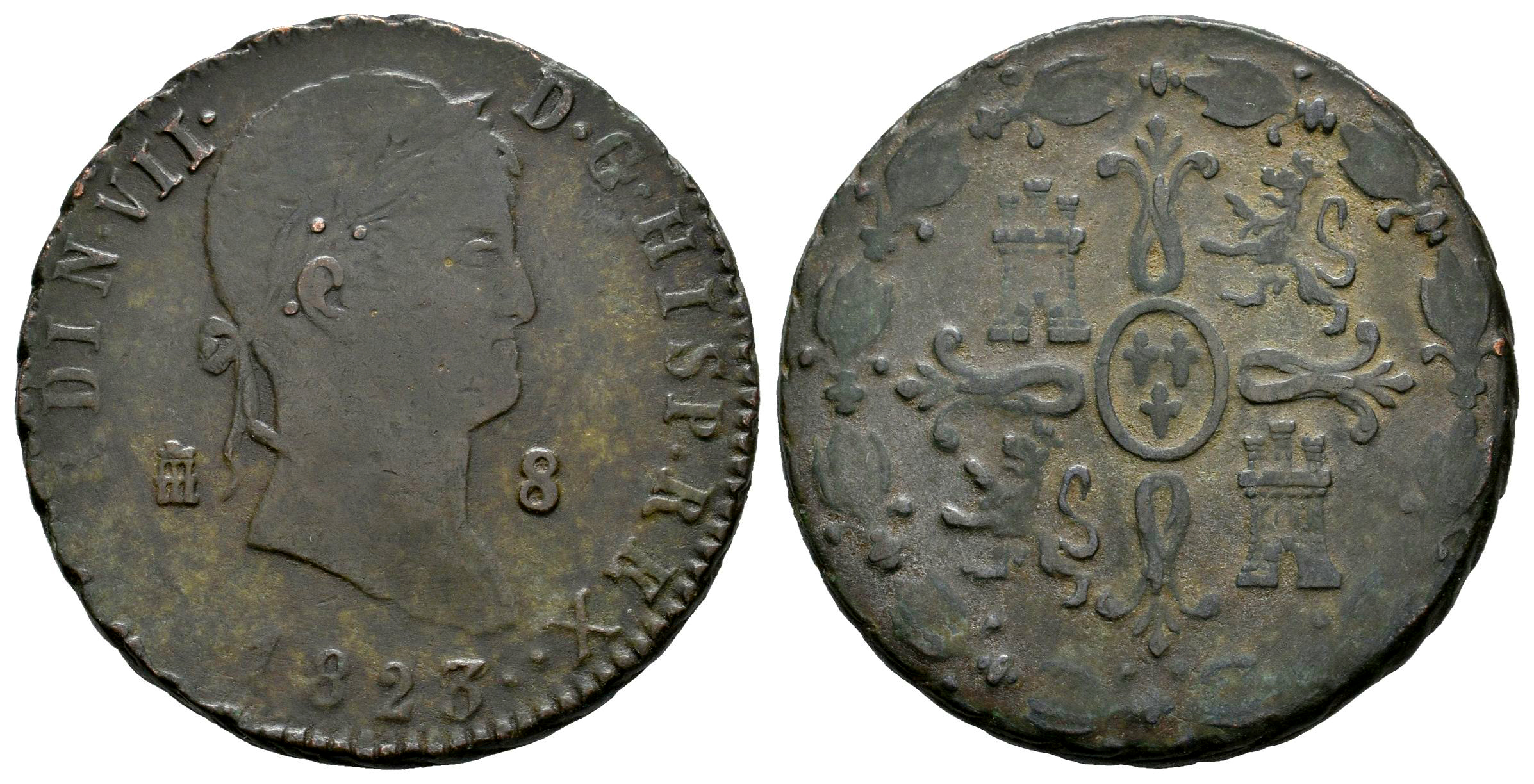 Ferdinand VII (1808-1833). 8 maravedis. 1823. Segovia. (Cal-223). Ae. 11,31 g. Two pellets to the right of date. Scarce. VF. Est...40,00.