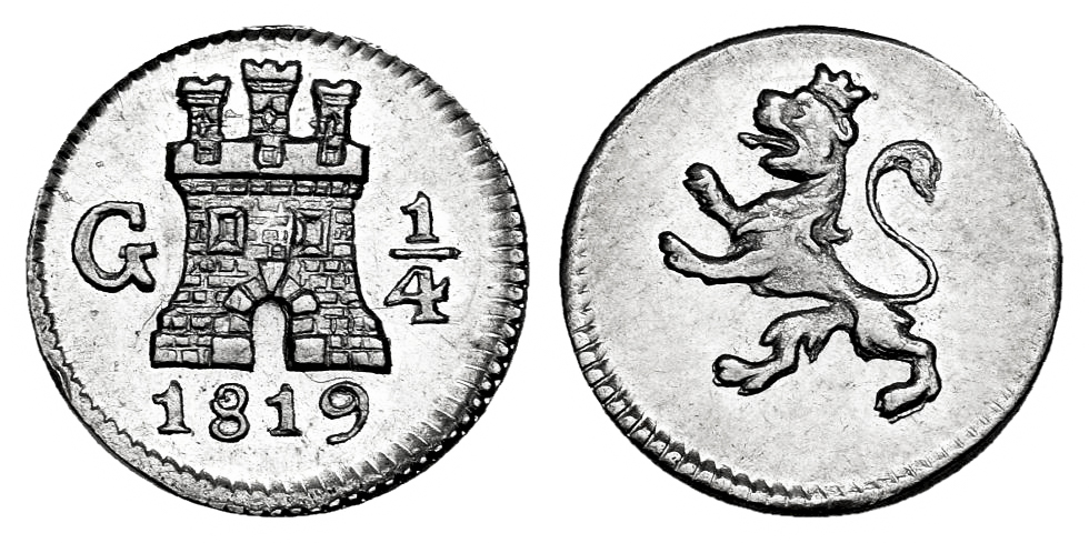Ferdinand VII (1808-1833). 1/4 real. 1819. Guatemala. (Cal-256). Ag. 0,85 g. Full original luster. Minimal hairline on obverse, yet very attractive. Almost MS. Est...250,00.
