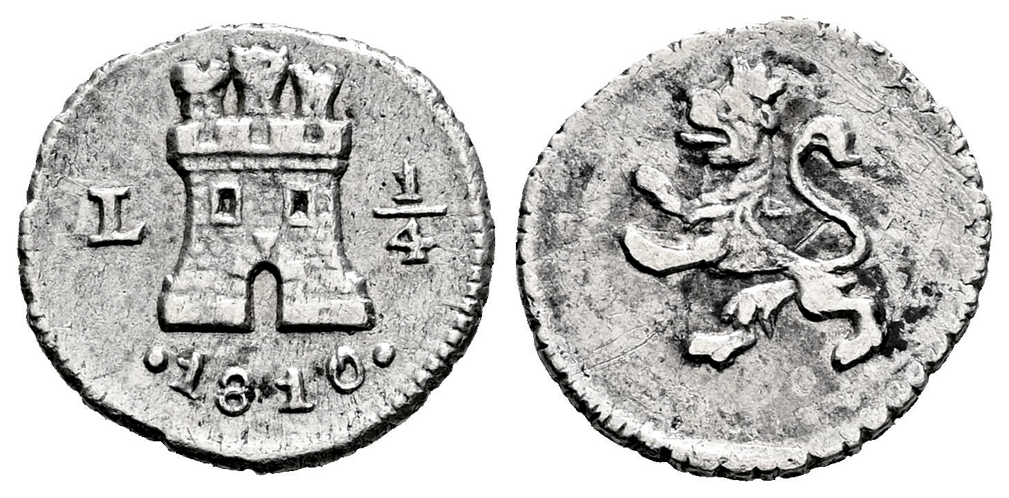 Ferdinand VII (1808-1833). 1/4 real. 1810. Lima. (Cal-261). Ag. 0,89 g. Cleaned. VF/Almost VF. Est...60,00.