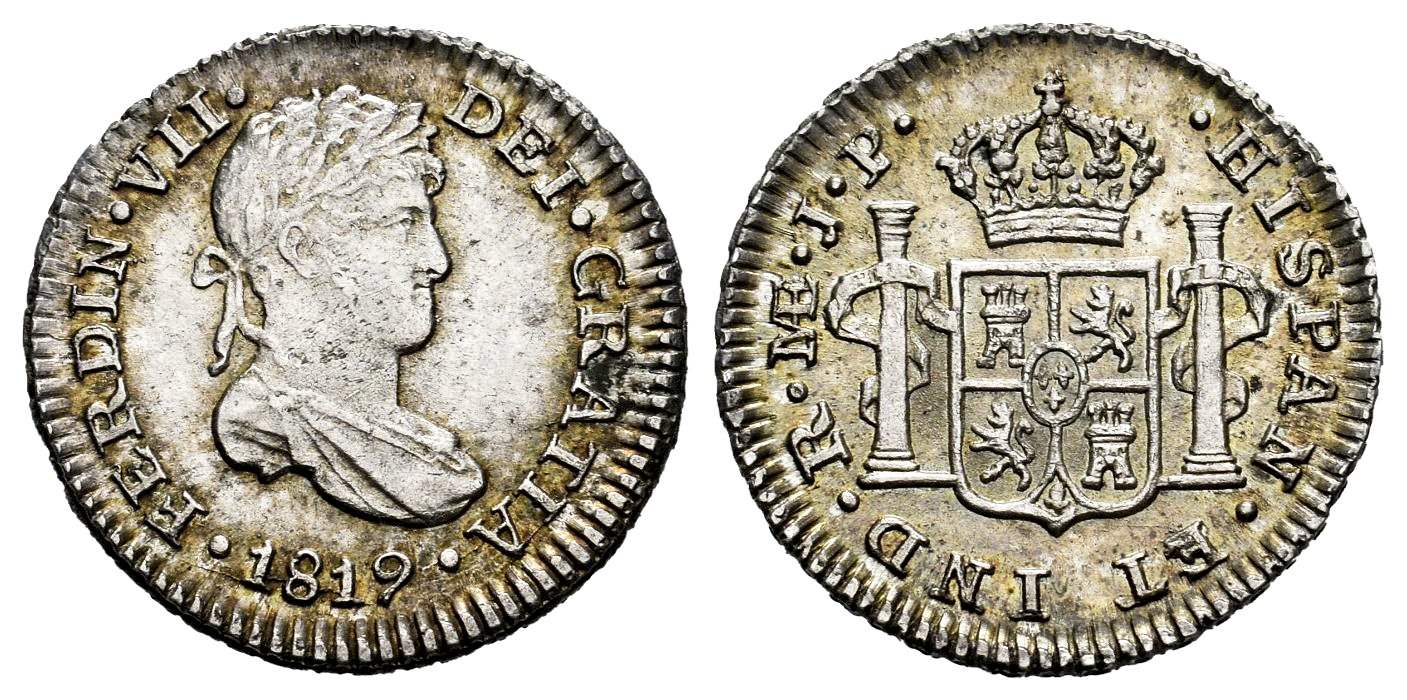 Ferdinand VII (1808-1833). 1/2 real. 1819. Lima. JP. (Cal-362). Ag. 1,75 g. Attractive patina. Traces of luster. Scarce in this grade. XF/AU. Est...150,00.