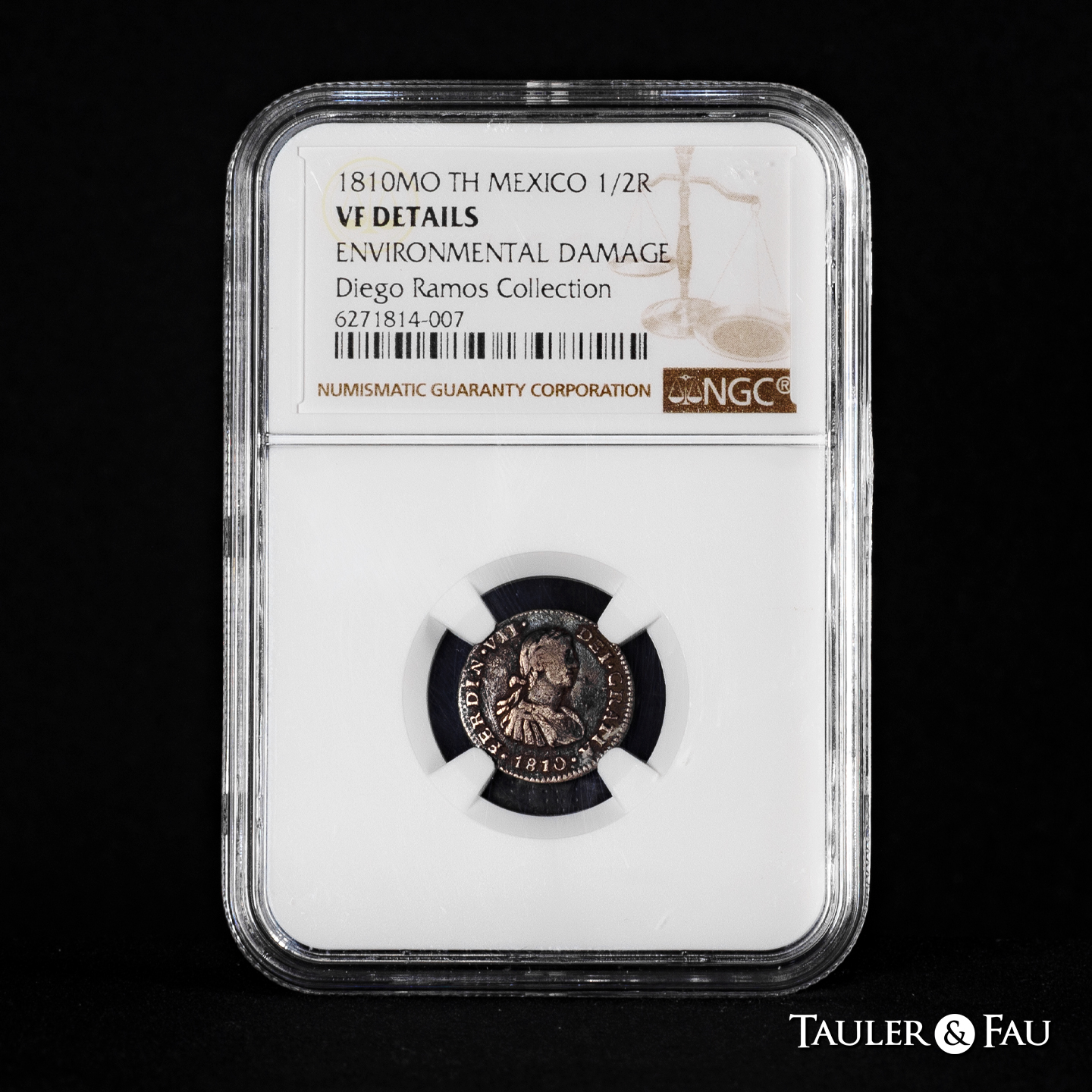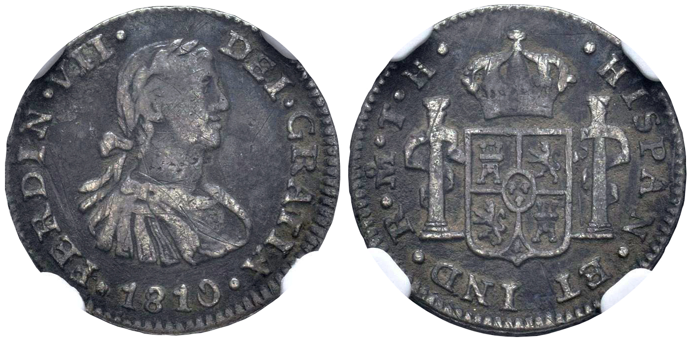 Ferdinand VII (1808-1833). 1/2 real. 1810. Mexico. TH. (Cal-391). Ag. Imaginary bust. Patina. Ex Diego Ramos Collection. Slabbed by NGC as VF Details, Environmental Damage. NGC-VF. Est...100,00.