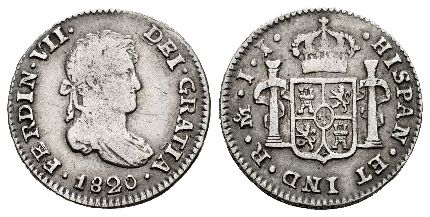 Ferdinand VII (1808-1833). 1/2 real. 1820. Mexico. JJ. (Cal-411). Ag. 1,67 g. Slightly cleaned. Almost VF/VF. Est...35,00.