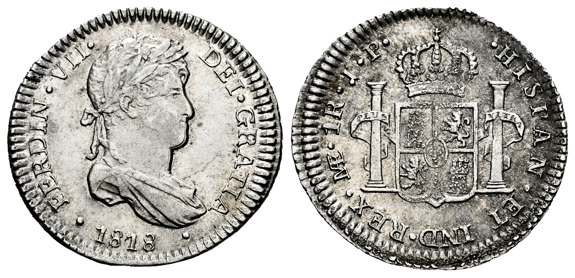 Ferdinand VII (1808-1833). 1 real. 1818. Lima. JP. (Cal-576). Ag. 3,58 g. Lightly toned. Original luster. Scarce in this grade. XF. Est...200,00.