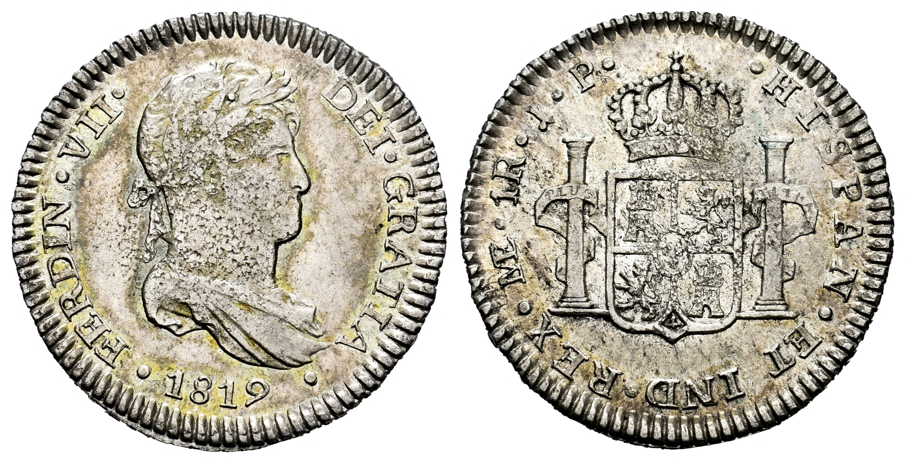 Ferdinand VII (1808-1833). 1 real. 1819. Lima. JP. (Cal-577). Ag. 3,20 g. Original luster with slight iridiscent shades. Weakness in the center, otherwise nice specimen. XF. Est...150,00.