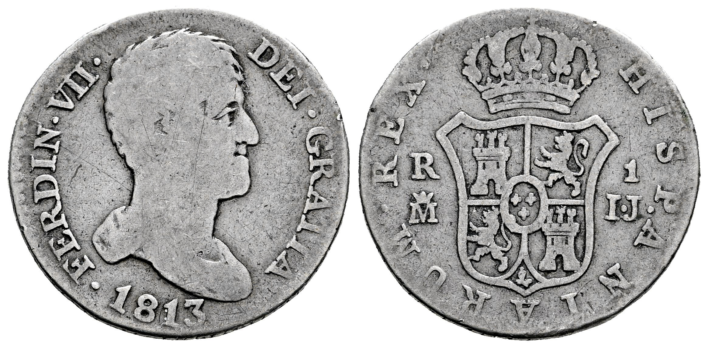 Ferdinand VII (1808-1833). 1 real. 1813. Madrid. IJ. (Cal-581). Ag. 2,80 g. Bare bust. Very rare. Choice F. Est...100,00.