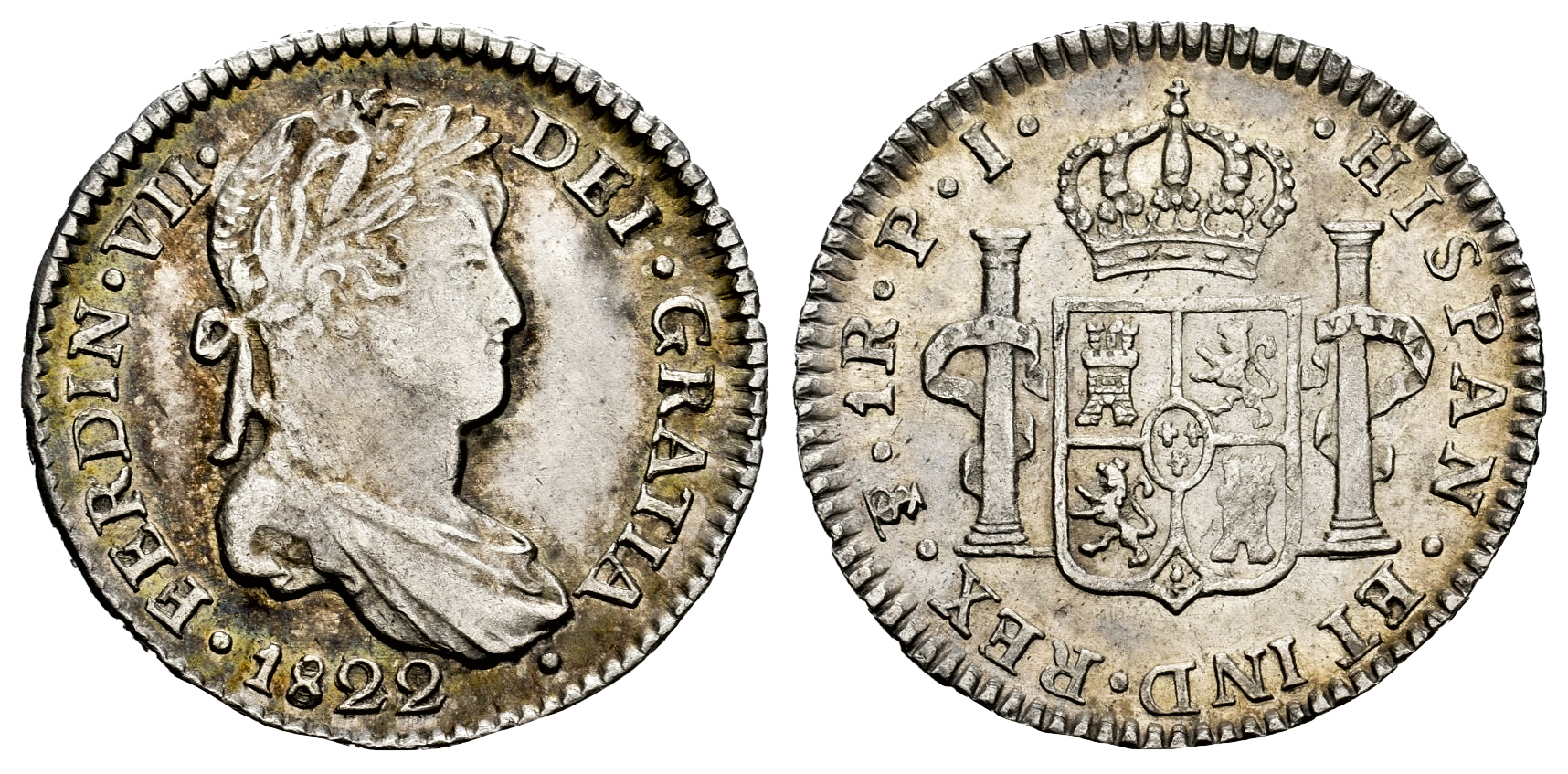 Ferdinand VII (1808-1833). 1 real. 1822. Potosi. PJ. (Cal-638). Ag. 3,28 g. Traces of luster. Slight patina. Almost XF. Est...120,00.