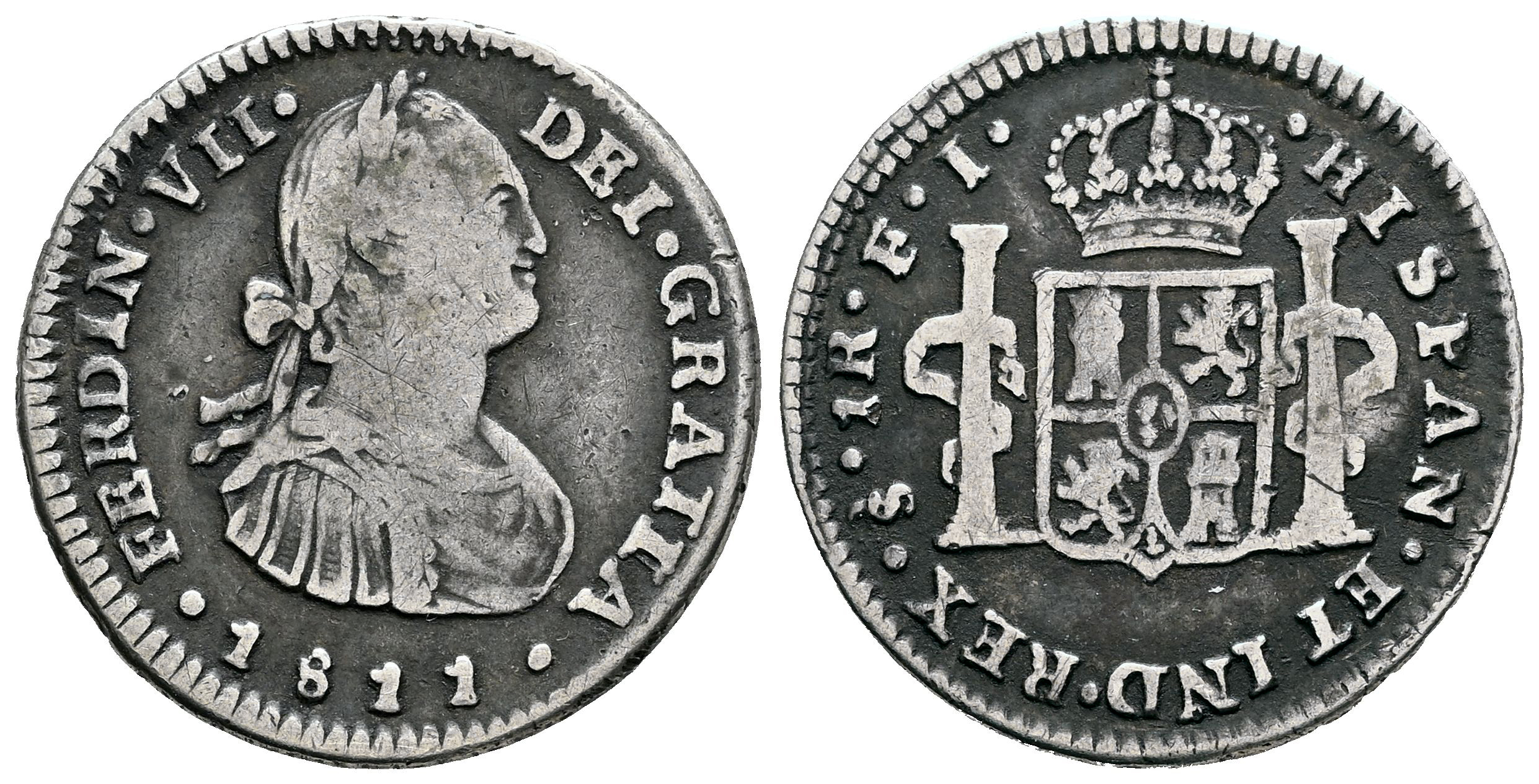 Ferdinand VII (1808-1833). 1 real. 1811. Santiago. FJ. (Cal-669). Ag. 3,25 g. Bust of Charles IV. Scarce. Choice F. Est...80,00.